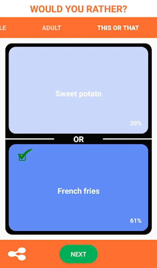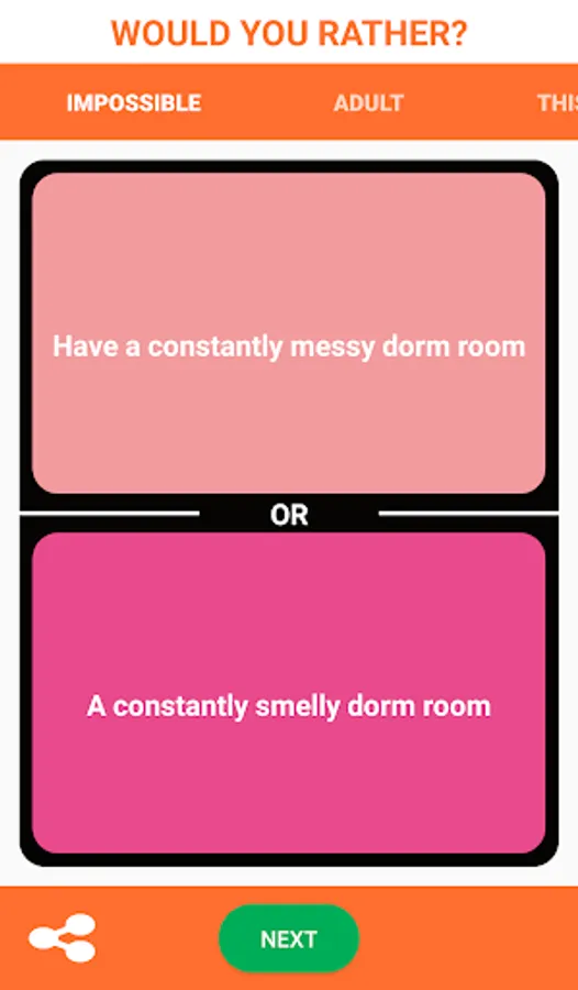This is a funny and interesting game that you can play in a party with your classmates or friends. In this game there are thousand plus questions in many categories, such as popular, impossible, love, party, hard, funny, life, food, silly, ridiculous, dating, this or that and many more. All the questions in the games are in the same sentence structure "Would you rather do A or do B?". And you can make your choice to see how many people choose the same answer as you. When you see the result you will be shocked by it.