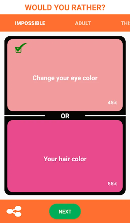 Would You Rather is completely free to play and can be played by young and adult. You can play it alone or with your friends at house or party. Just pick would you rather this or that scenario and see which scenario is higher and which scenario is lower voted.
