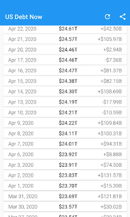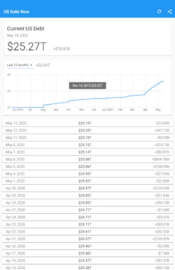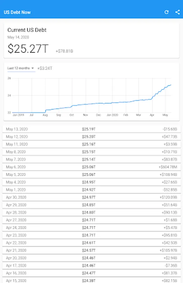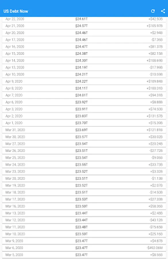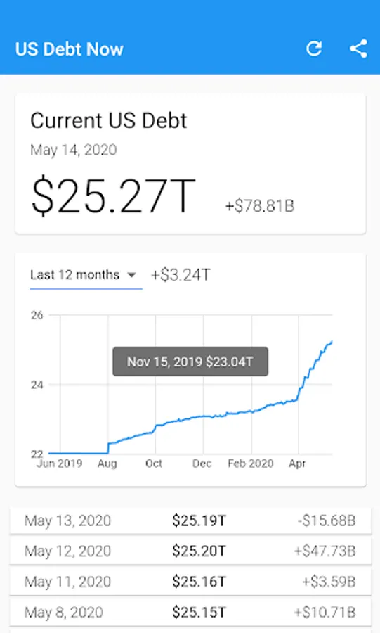 The US Debt Now app displays the daily amount of the US National Debt over the past 25+ years. You can see the trending of the debt in an interactive chart with data updated each day as the Treasury publishes the new amount.