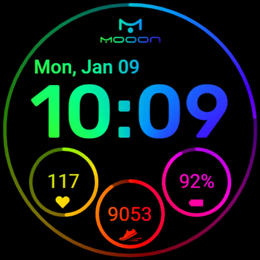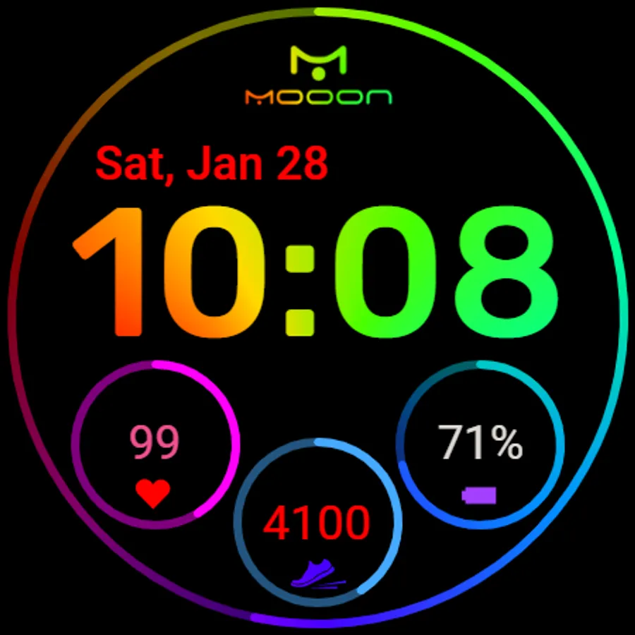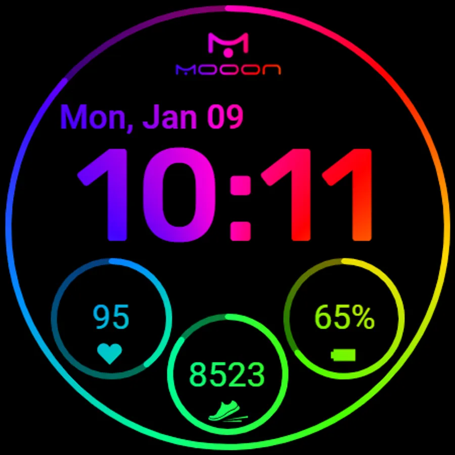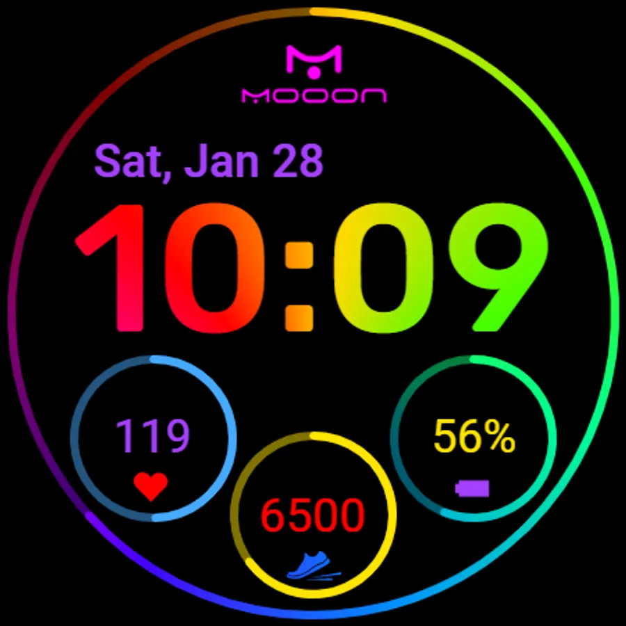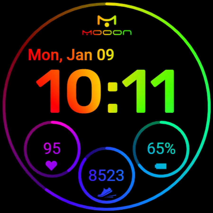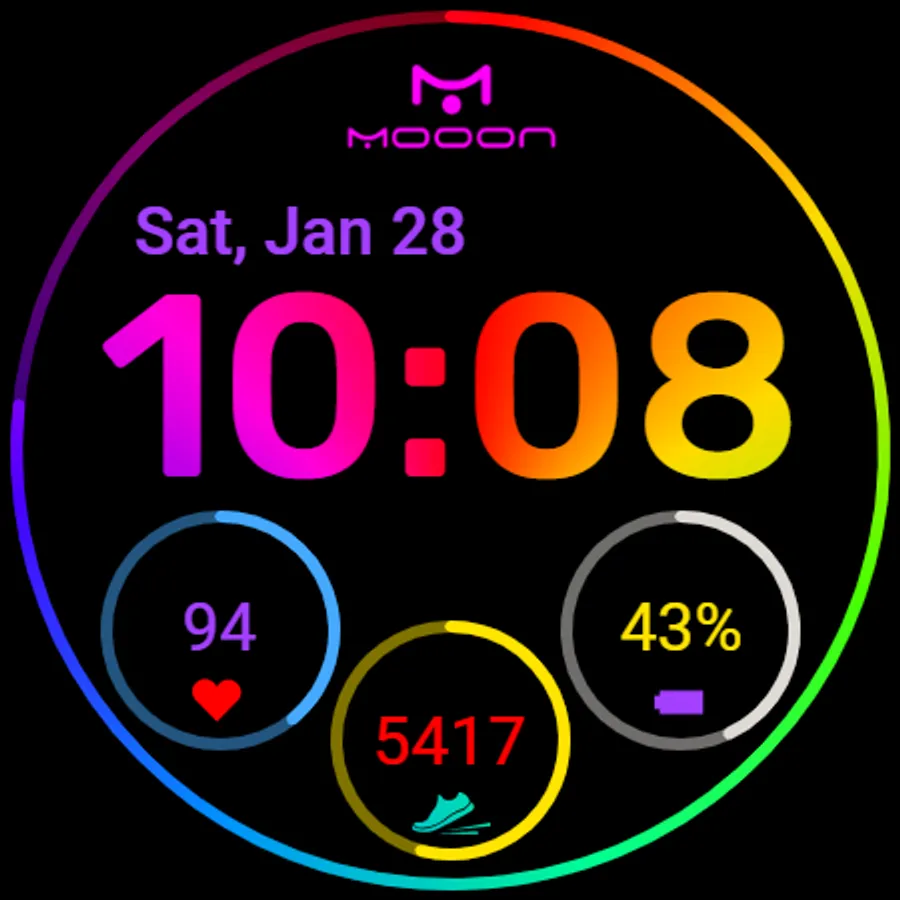 Multicolored watch face with digital clock, date, step counter and heart rate monitor.