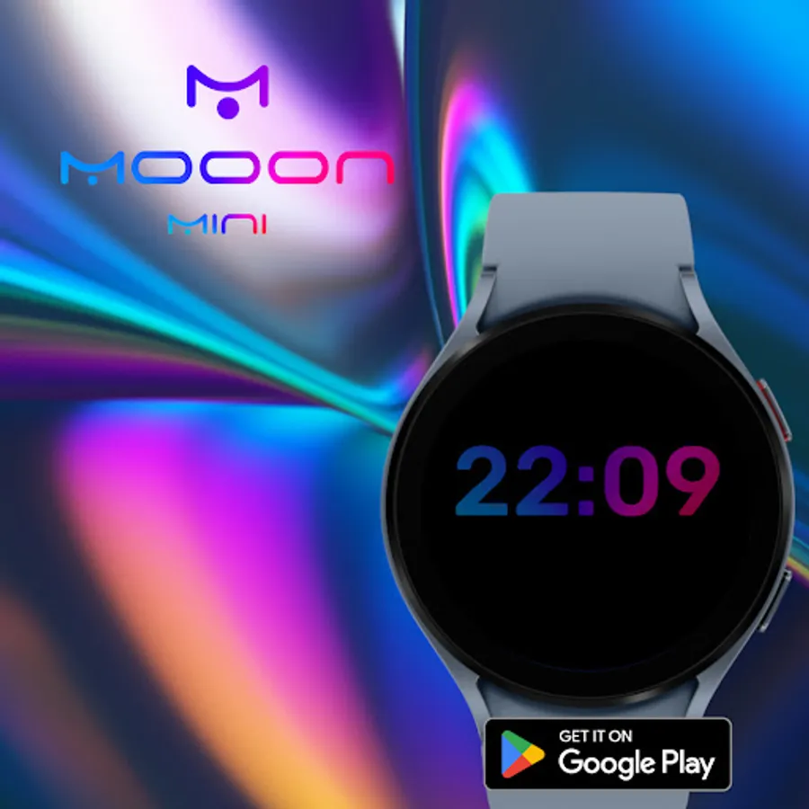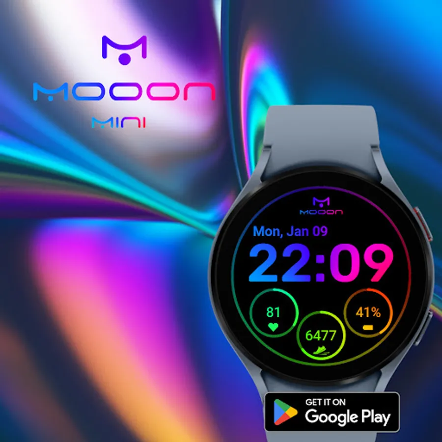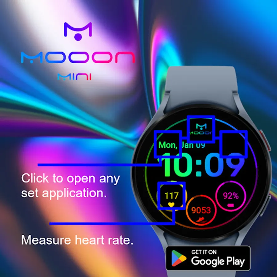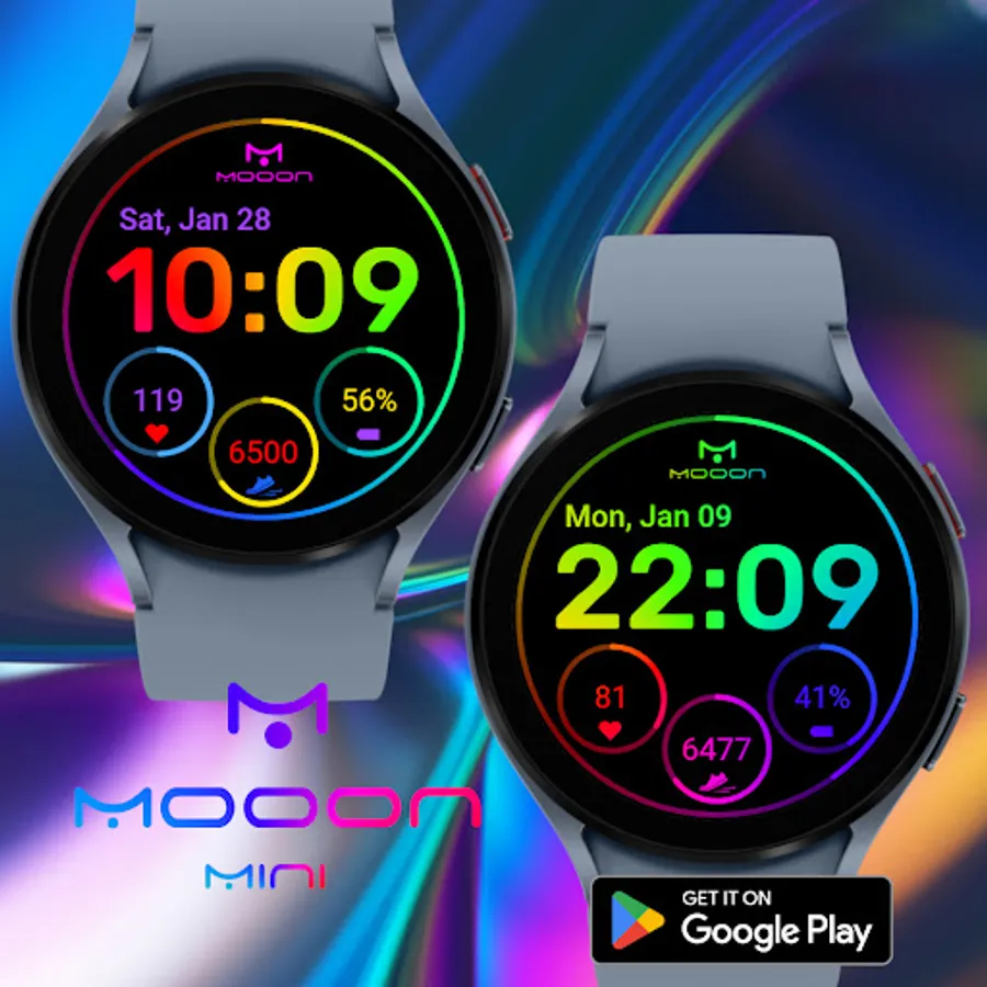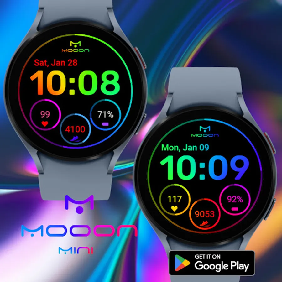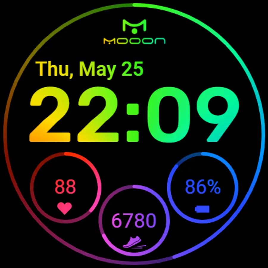Multicolored watch face with digital clock, date, step counter and heart rate monitor.