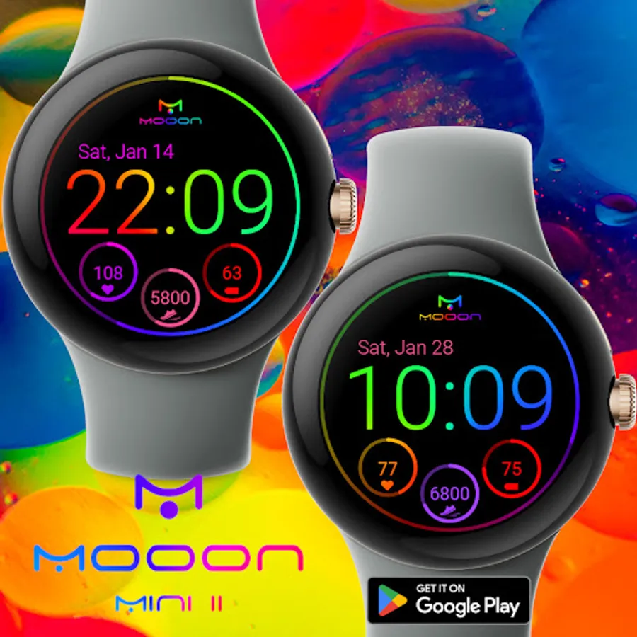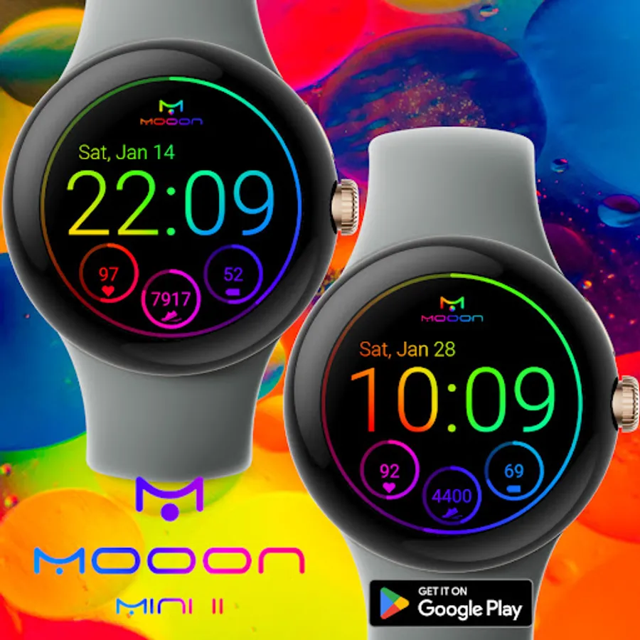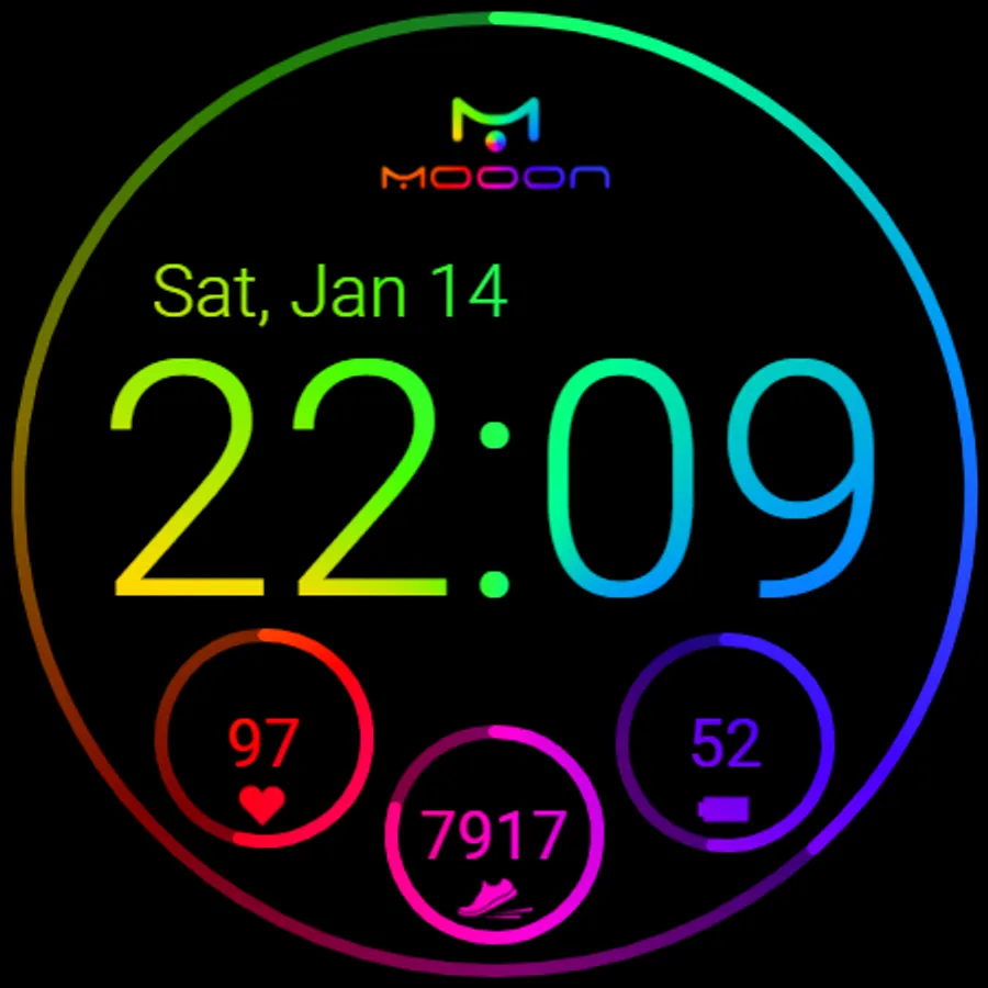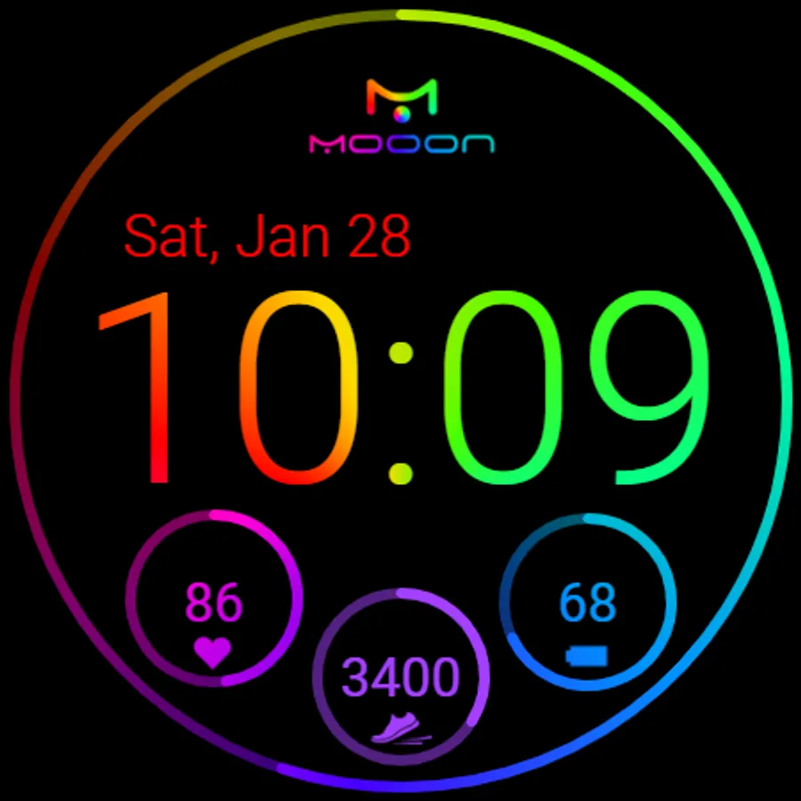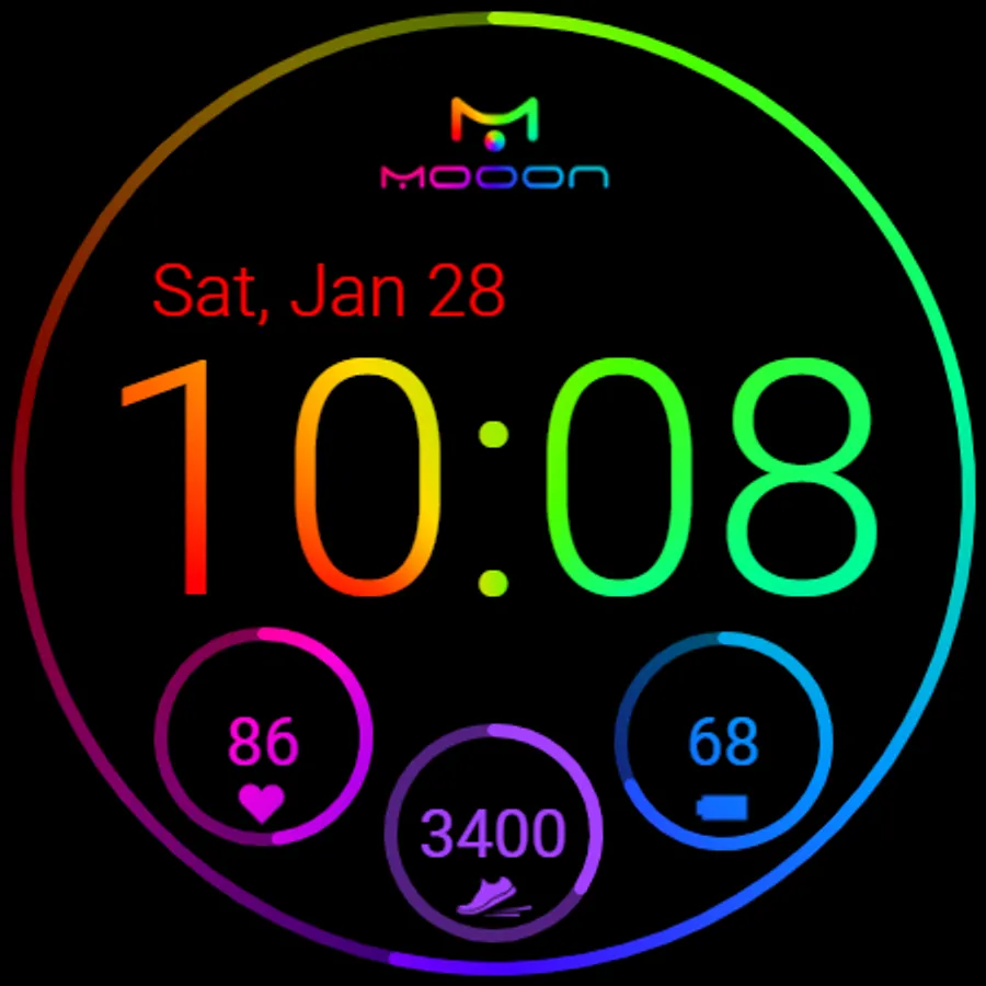 Multicolored watch face with digital clock, date, step counter and heart rate monitor for Wear OS.