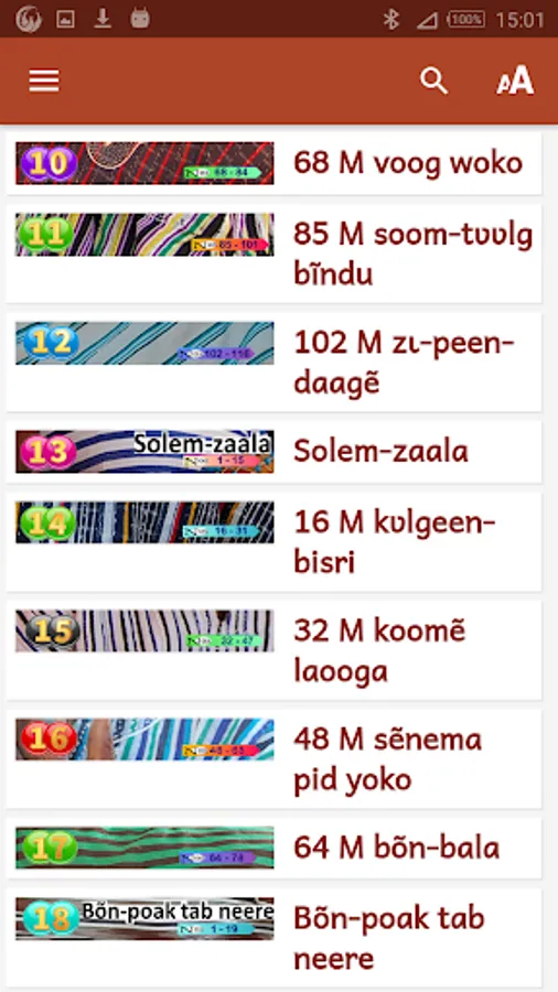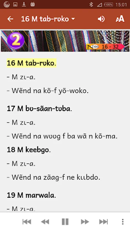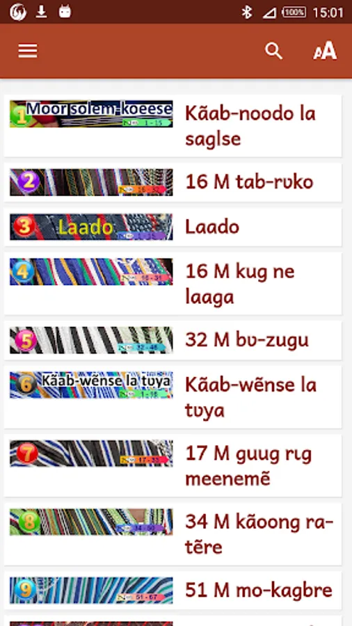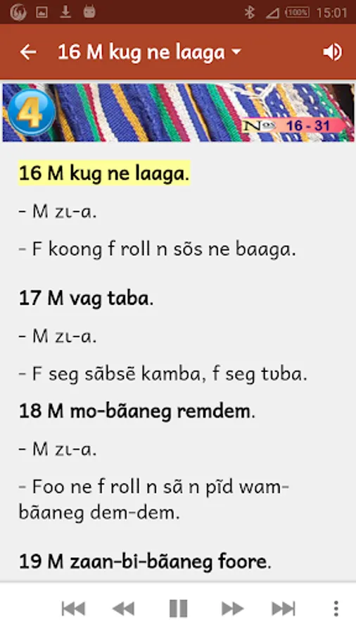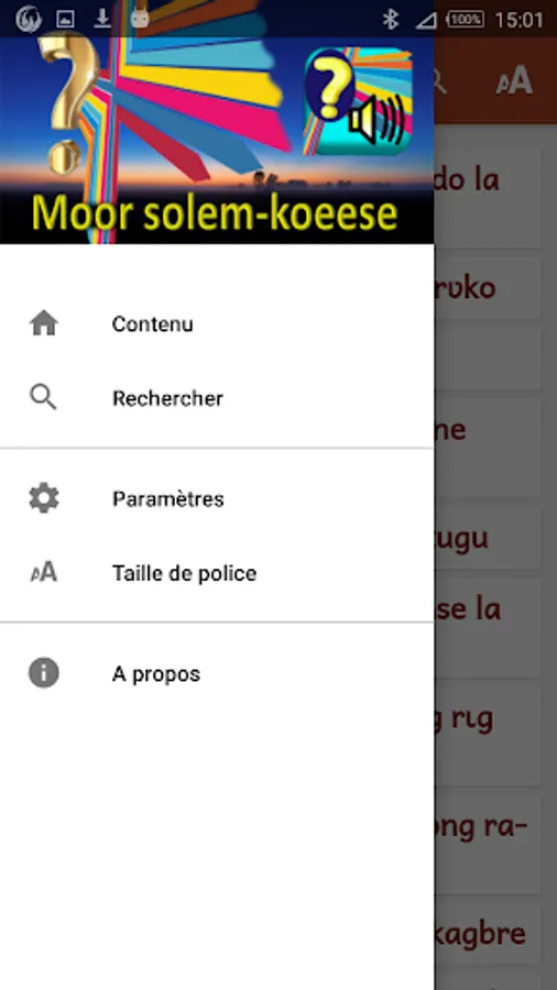 This application presents you with 291 riddles in the Mooré language, spoken in Burkina Faso. The sentences or questions are surrounded by music to give you time to think.