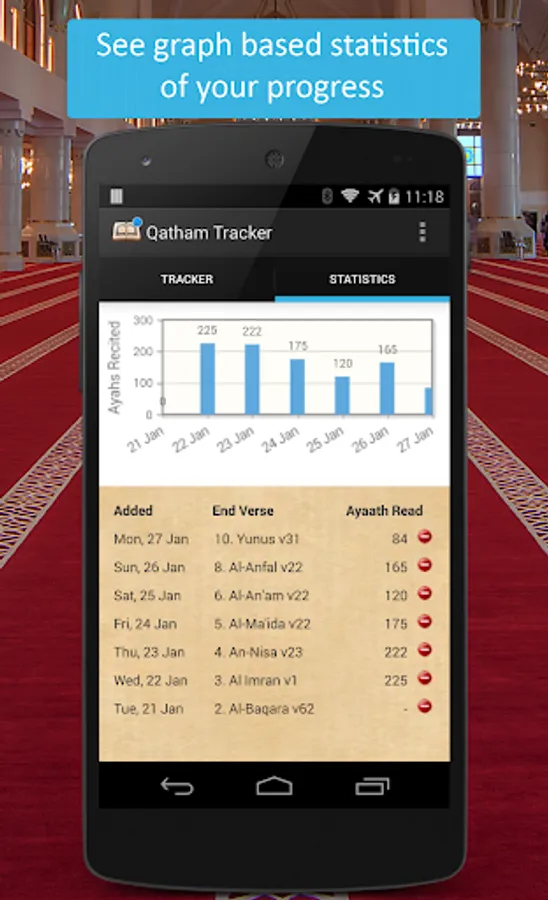 Graph based statistics to how many Aayaath you have recited each day.
