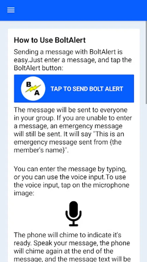 • You can speak or text your message, depending on the situation. BoltAlert is completely private, and all messages are encrypted. Your data is secure!