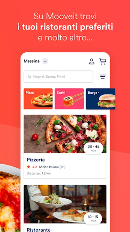 On Mooveit you can find food at home and more. You can order anything you want from the best businesses in the city: restaurants, bakeries, butchers, fishmongers and much more. Your favorite neighborhood shops in Messina, you can find them only on Mooveit! Don't waste time, make your choice, order and we'll take care of delivery!