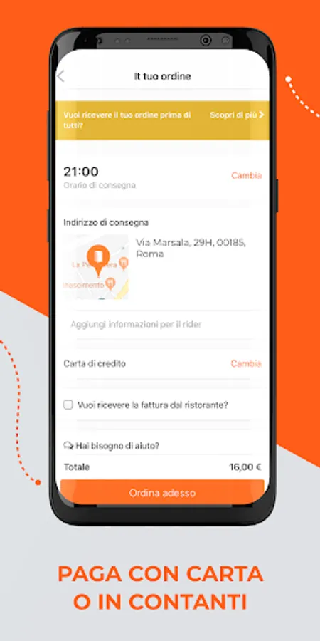 Ordering at home is very simple: we deliver dishes from restaurants in your city with no distance limits and you can pay as you prefer, either by card or in cash.