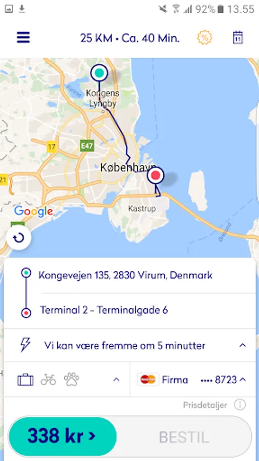 Vi finder den billigste rute, inden vi udregner din fastpris. Vi bruger Google Maps til at udregne ruten, og vil altid tilbyde dig den korteste af Googles ruteforslag. Googles logik tager højde for trafikforhold, så du ikke behøver at tænke på det.