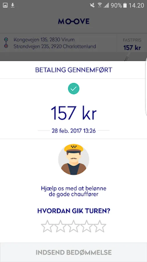 Vi har sat endnu mere fokus på service. Hjælp os ved at bedømme din oplevelse med MOOVE hver eneste gang - så garanterer vi, at kun de bedste chauffører repræsenterer MOOVE.