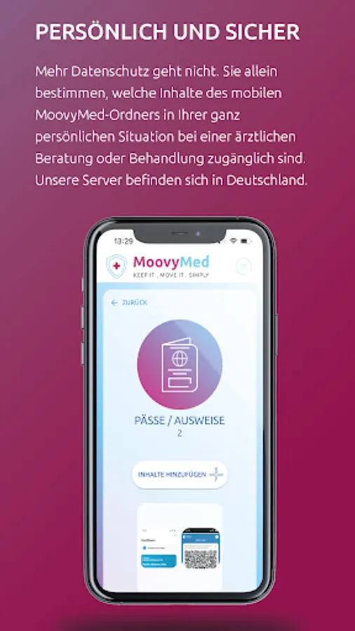 The patient alone determines which contents of his mobile MoovyMed folder are accessible in his very personal situation during a medical consultation or treatment. Without complicated and time-consuming authorization processes. And still data secure. Our servers are located in the European Union.