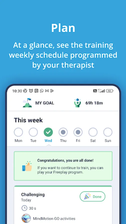 Patients can always see the therapeutic objective defined with their therapist to stay motivated to perform their therapy. They are also informed on the total training time they have completed with the MindMotion GO since the beginning of their therapy.