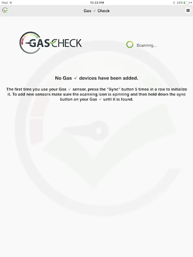 1. To pair your Gas Check sensor to the phone, simply press the "Sync" button on the back of the sensor while the app's main screen is visible. The first time you use your Gas Check sensor you must press the "Sync" button 5 times in a row in order to wake up the sensor.