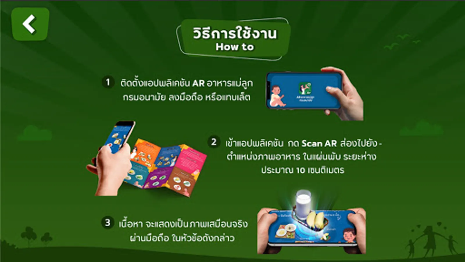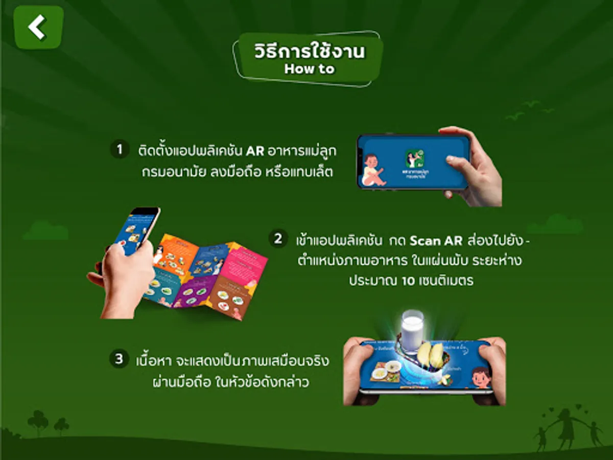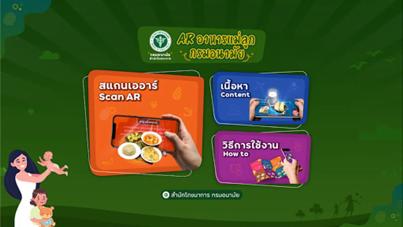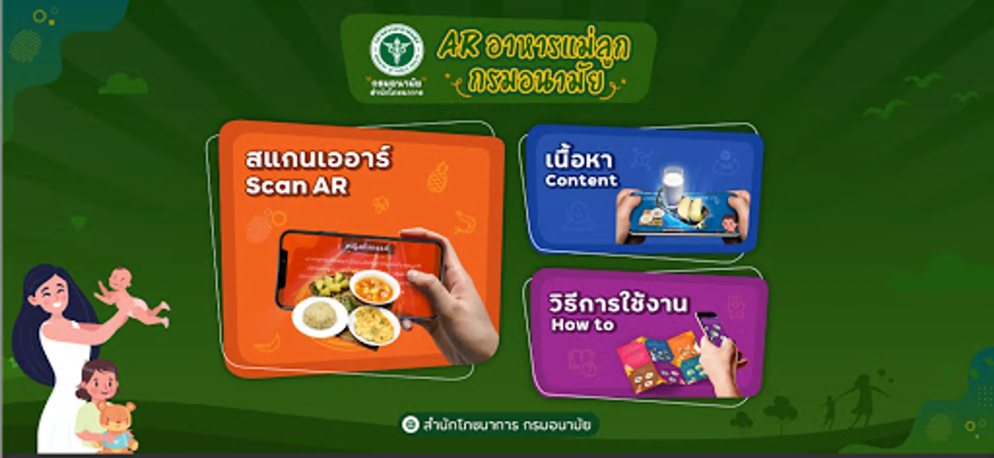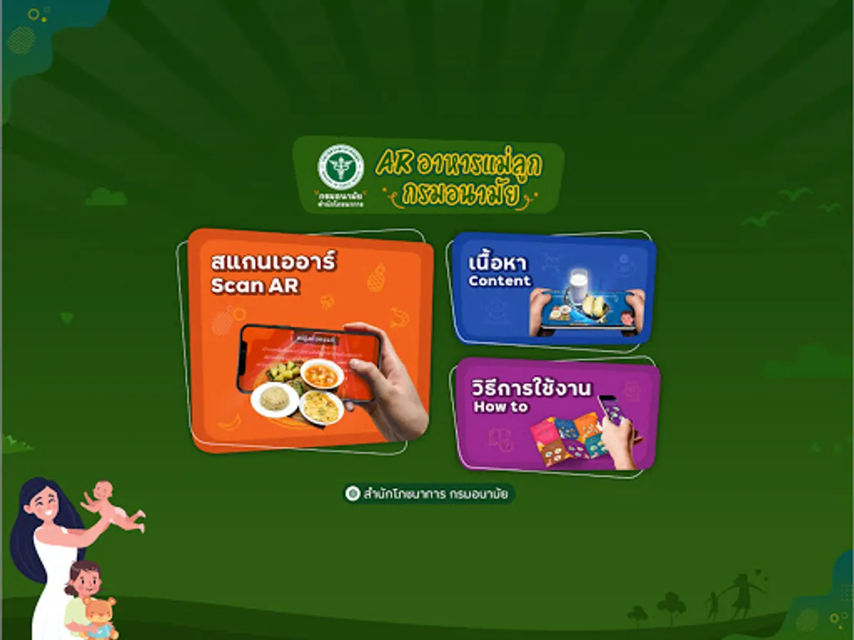 It is an app that helps mothers to make informed choices about healthy and nutritious meals for their babies. From prenatal to children aged 5 years through AR (Augmented Reality) technology, which can be shined through the Marker from a brochure given at the hospital. And community health under the Ministry of Public Health nationwide