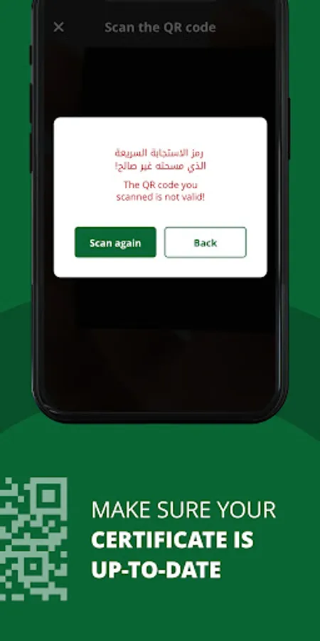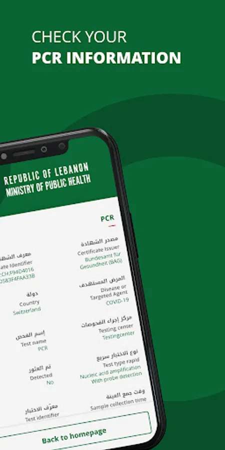 In case the user has a generated certificate from the Ministry of Public Health (MOPH) about his test result (Rapid or PCR test), the application can scan their DGC QR code and provide the following information: