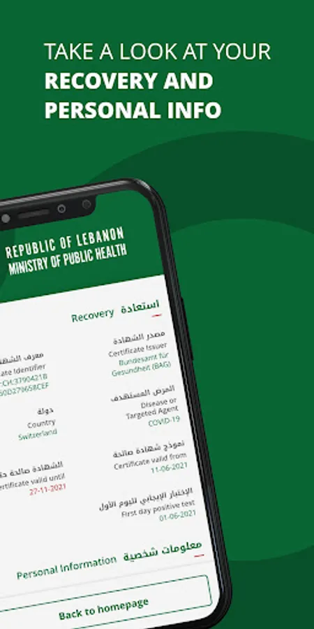 In case the user has a generated certificate from the Ministry of Public Health (MOPH) about his recovery from Covid-19, the application can scan their DGC QR code and provide the following information: