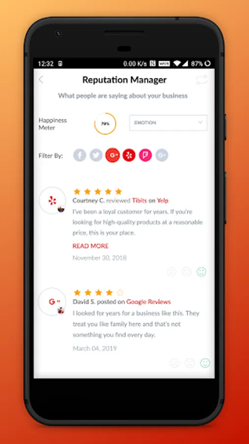 The ReviewRev app gives you on-the-go access to Testimonial Collector, Reputation Manager, and Competition Tracker. Send surveys to customers straight from your phone, monitor all your reviews from one place, and keep an eye on what people are saying about your top competitors online.