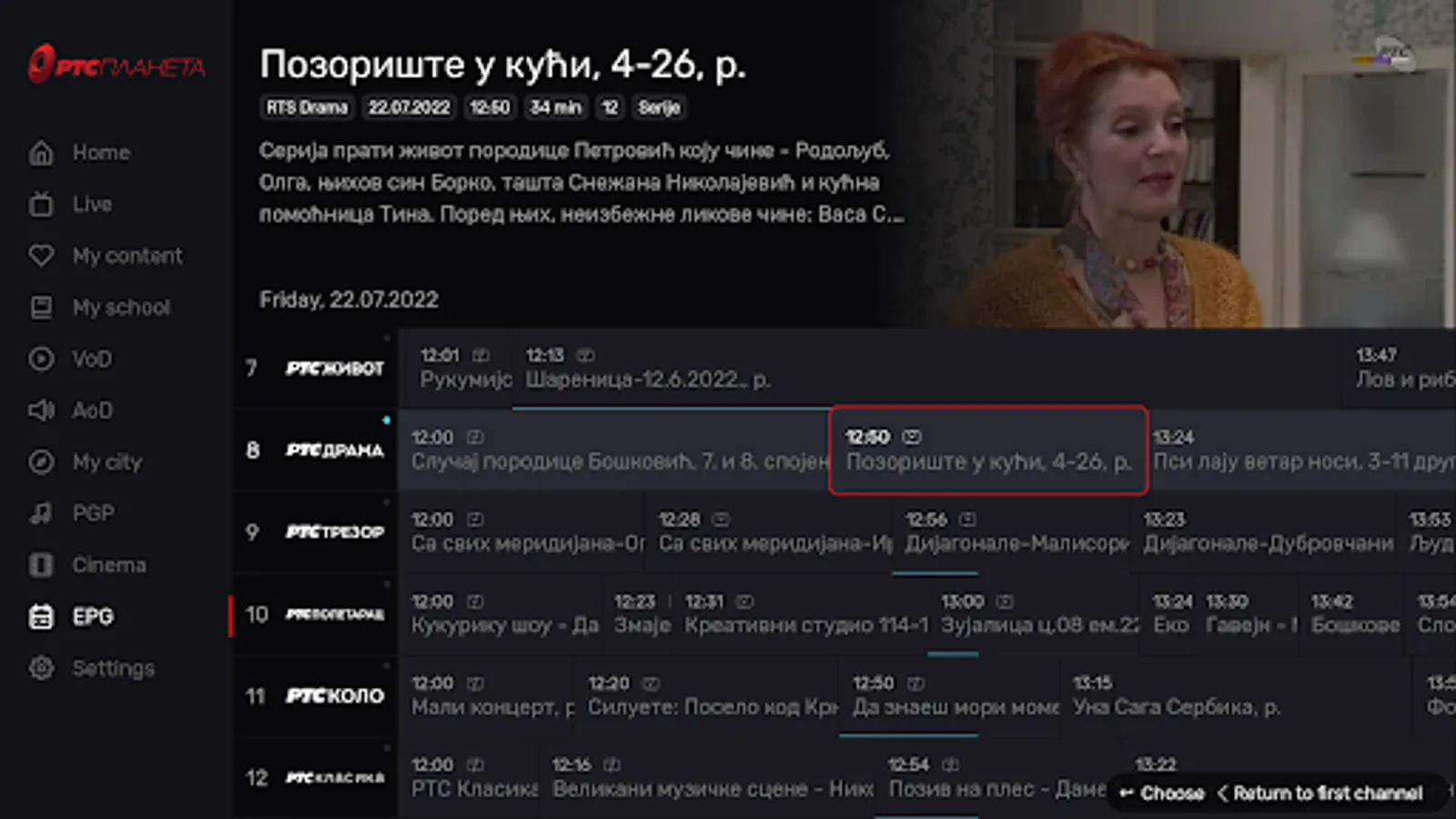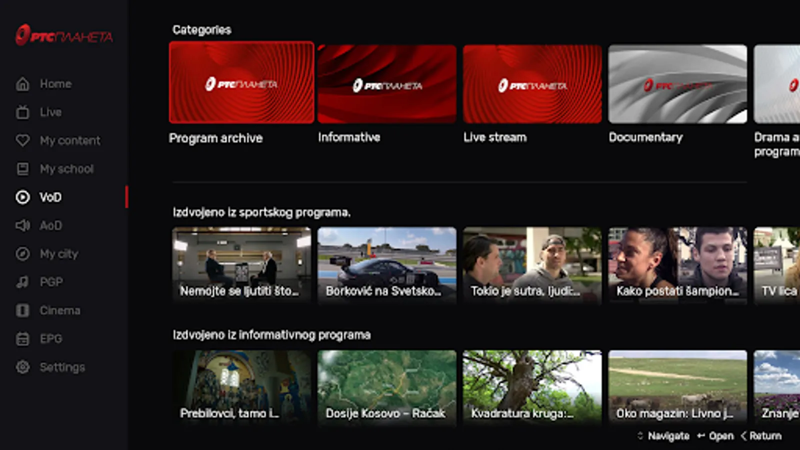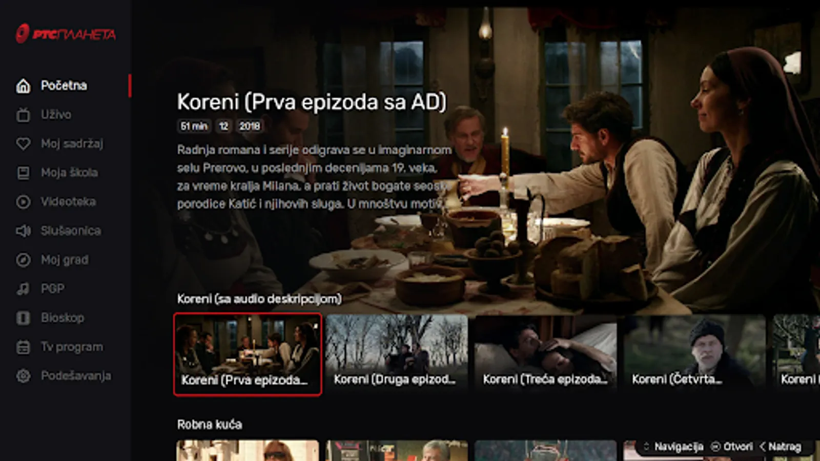 RTS Planeta is a internet TV and radio platform that allows you to watch TV and radio programs of the Media Public Service of Radio-Television of Serbia, Catch Up service of 72 hours (delayed viewing of program content), Video on demand and Audio on demand (TV monitoring and radio shows within the Videoteka and Slušaonica), as well as individual stories within the whole Moj grad from the correspondent network of RTS. Also, on the multimedia platform RTS Planeta, PGP RTS music releases are also available. For the monitoring of the RTS Planeta service, the user must download the RTS Planeta application, ensure Internet access and the correct operation of the receiving device.