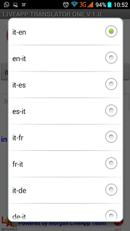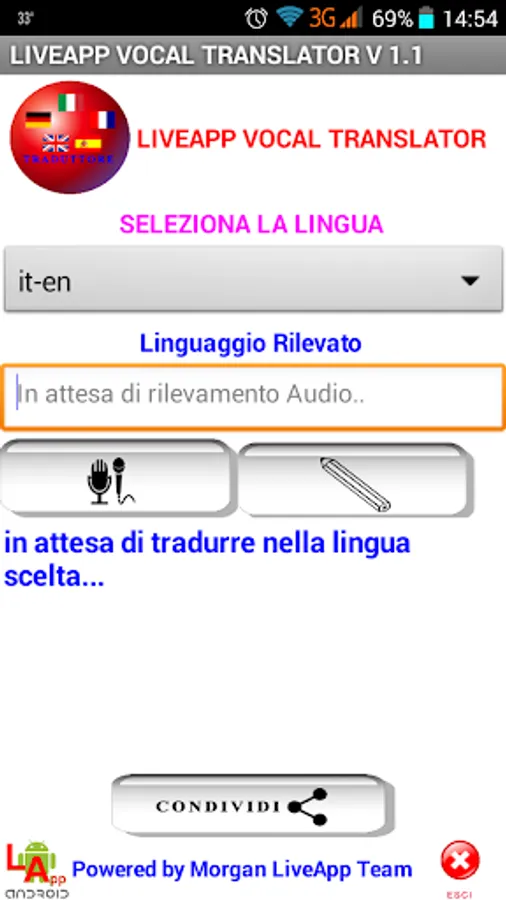 You'll have ONLY Select language you want to Translate the sentence and PRESS the " translate " then pronounce Your sentence in Italian OR your language , and wait The translated ! LiveAppTranslator repeat vocally Your sentence Translated in the language that you have choice and you'll see the phrase written in the same language spoken ,than you can SHARE with all messaging applications on Your Smartphone !