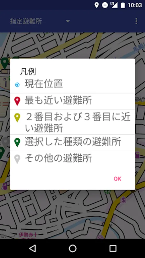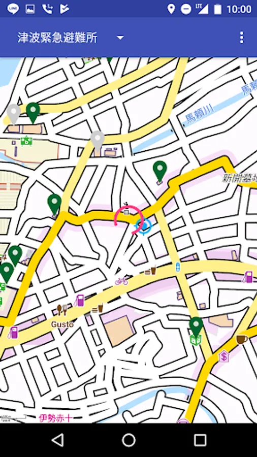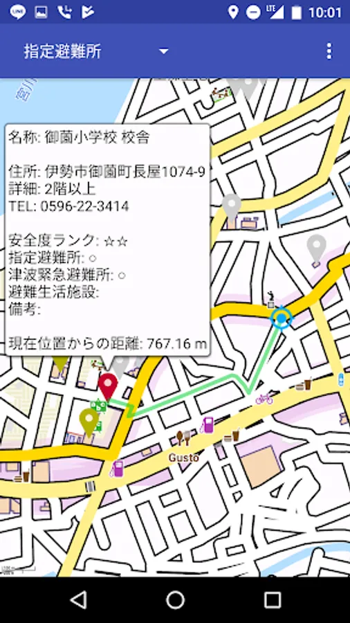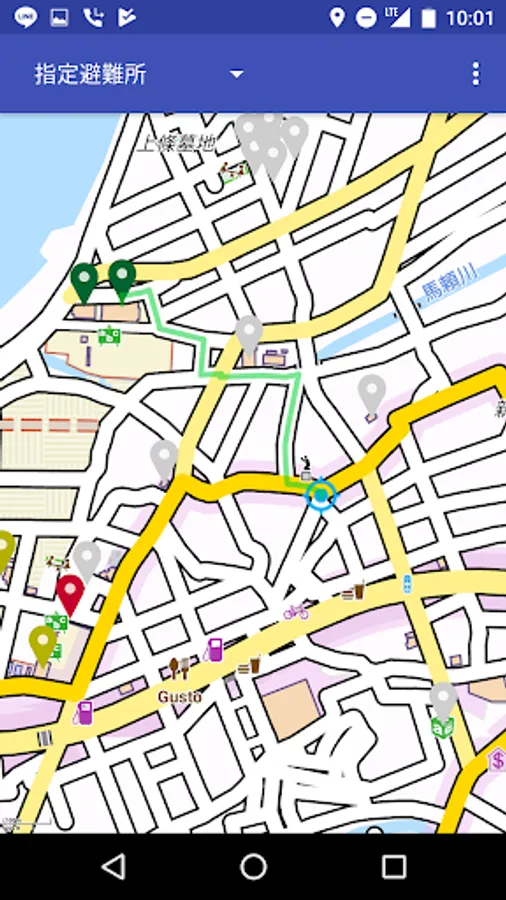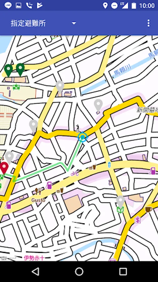 You can display the route to the evacuation center by long-pressing the marker of the shelter on the map.