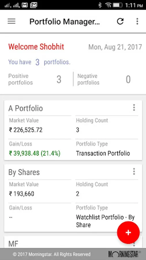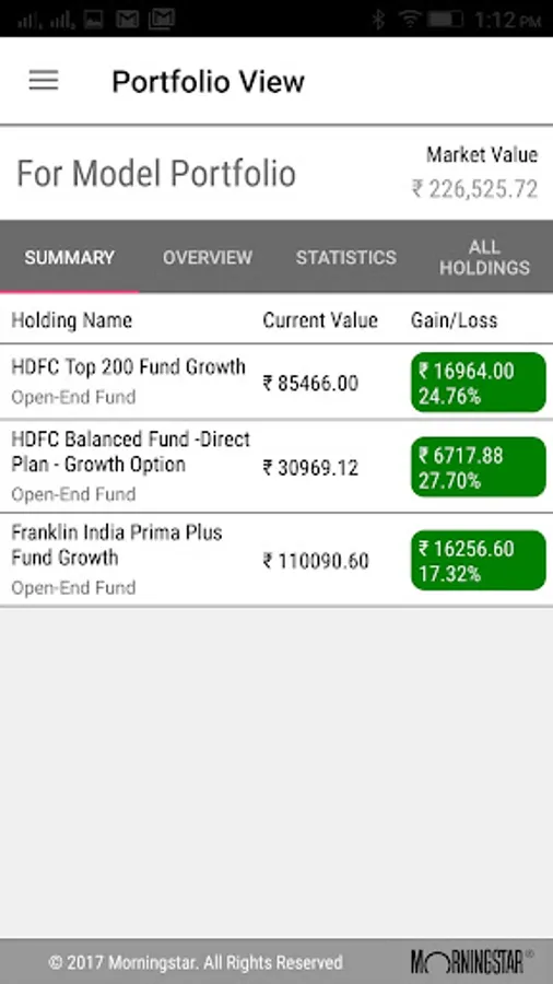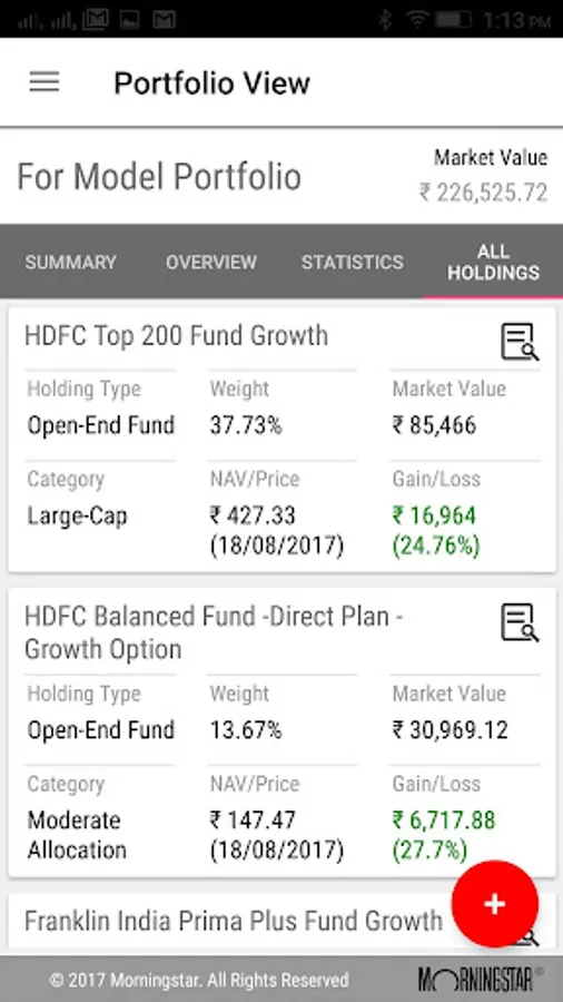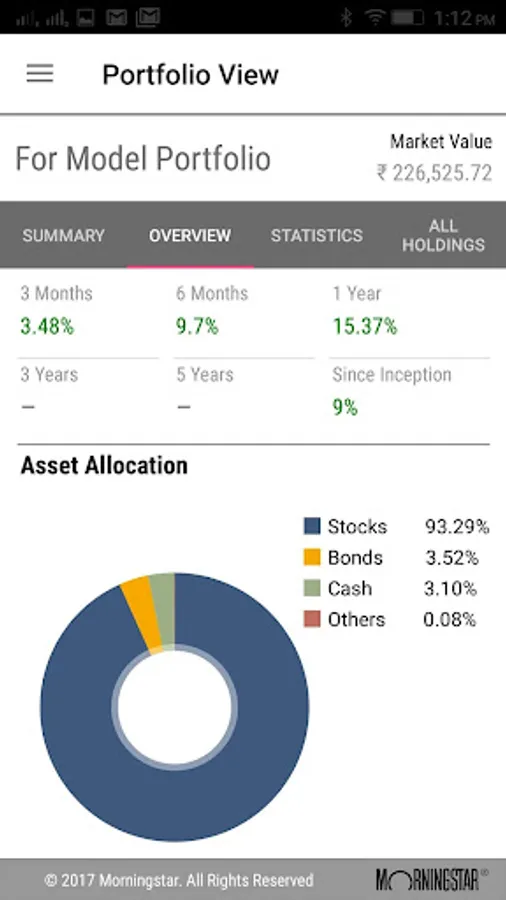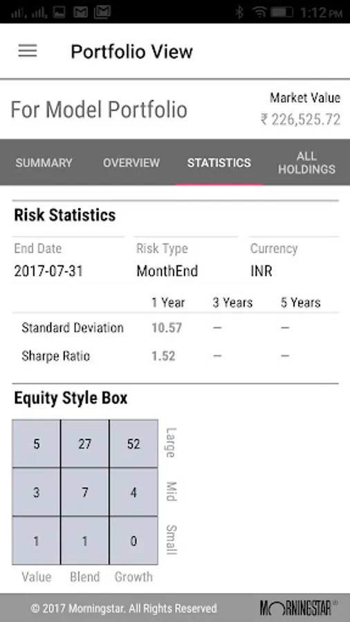 Create and monitor portfolio characteristics and performance through time by entering actual transactions, or, simply check on a portfolio’s current allocation. Know how your funds are rated by Morningstar with Star Ratings and Analyst Ratings. Get risk statistics, Style box, performance at portfolio level. Supports both Watchlist and Transactional portfolio.