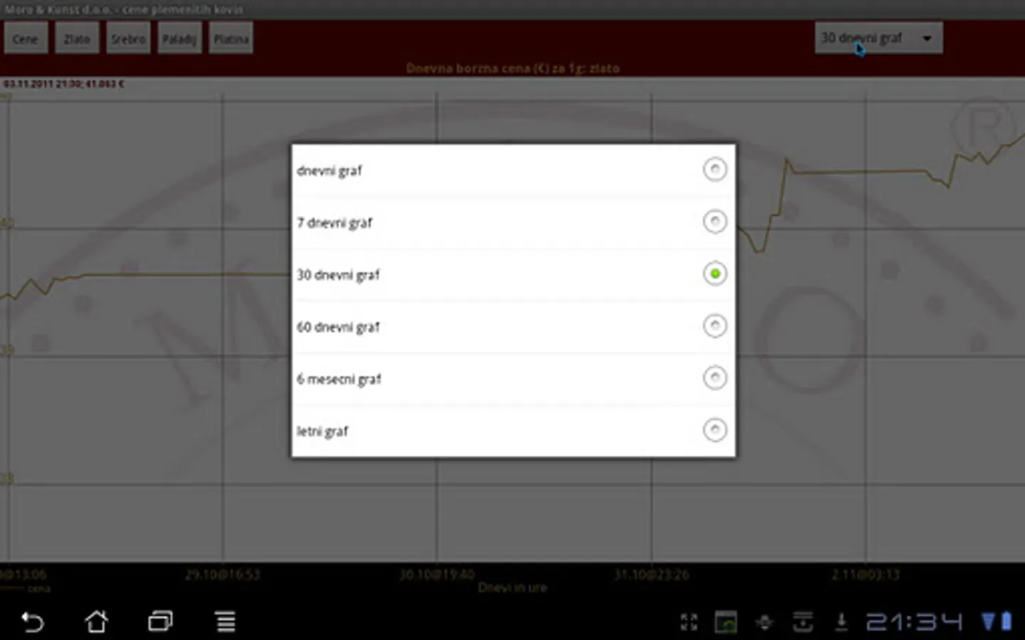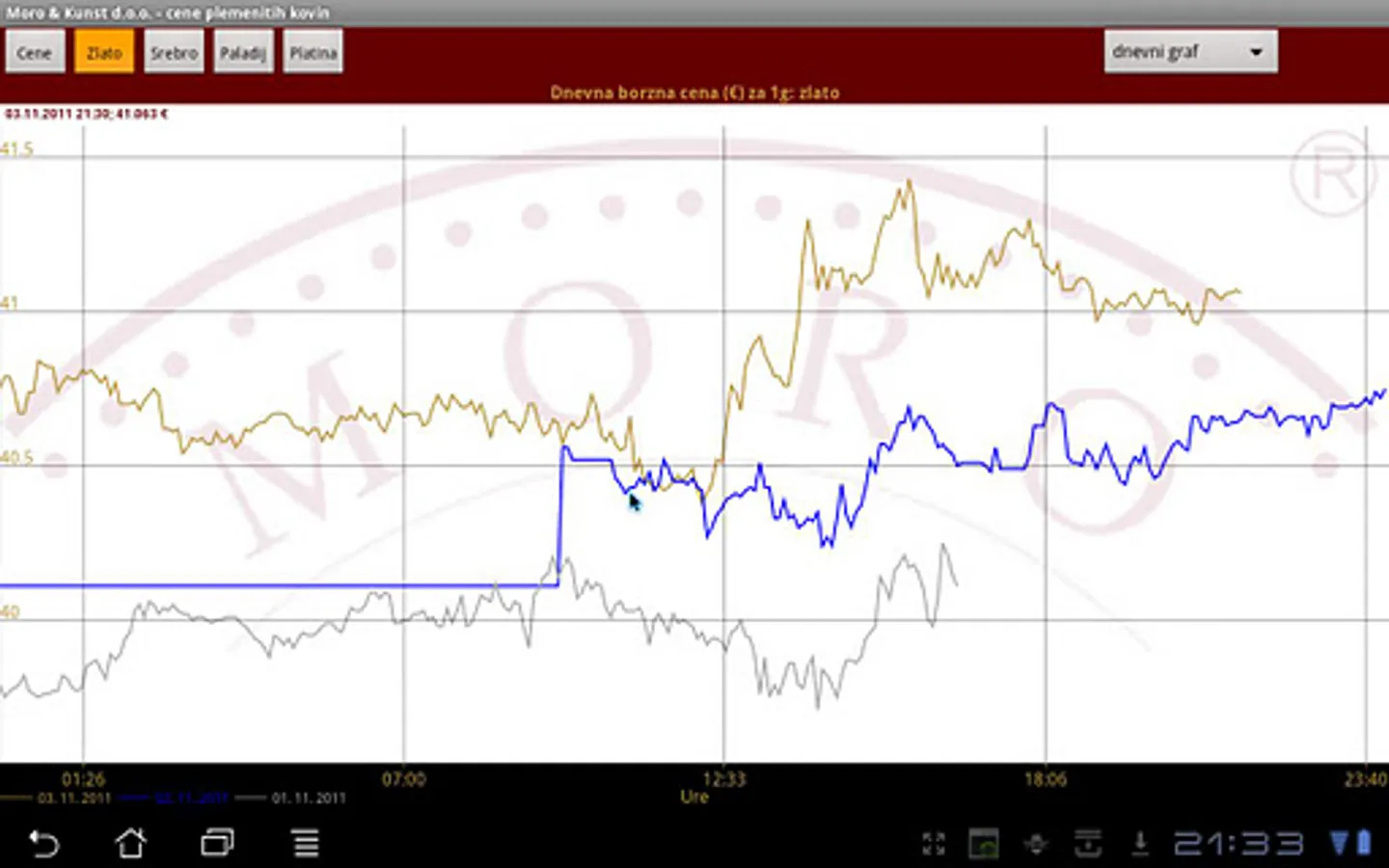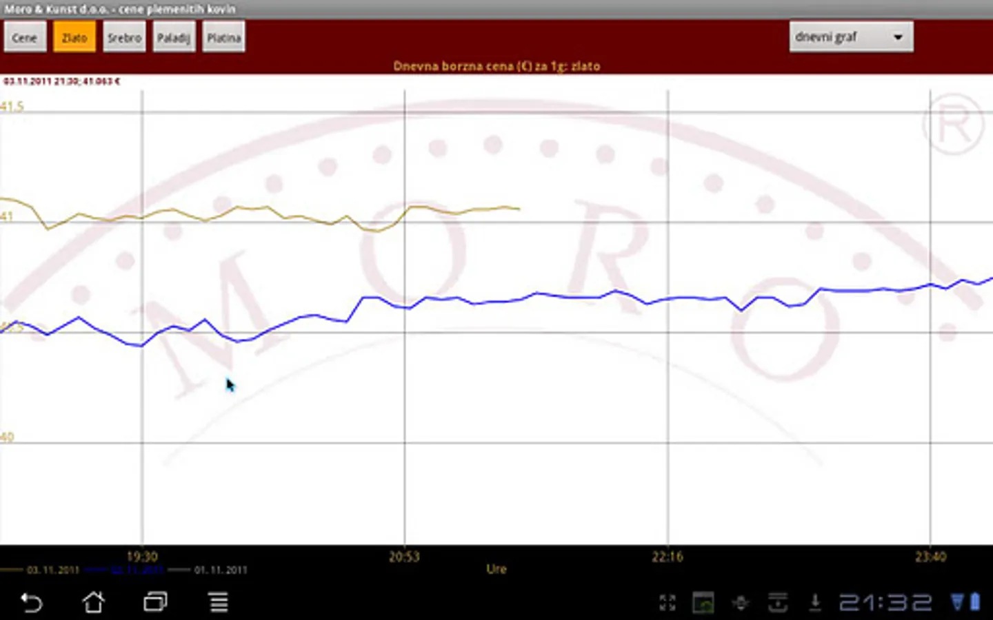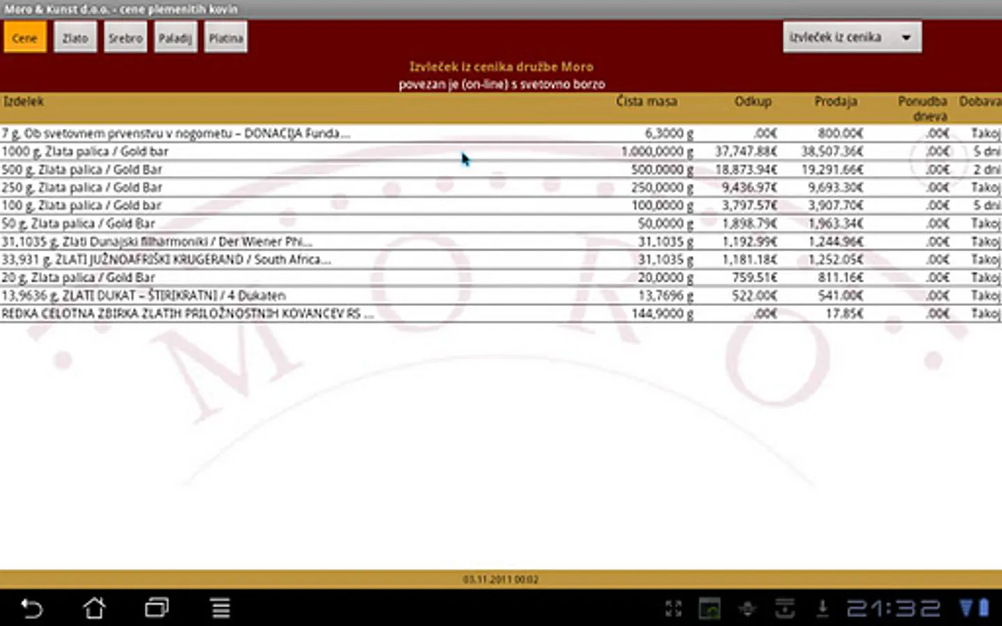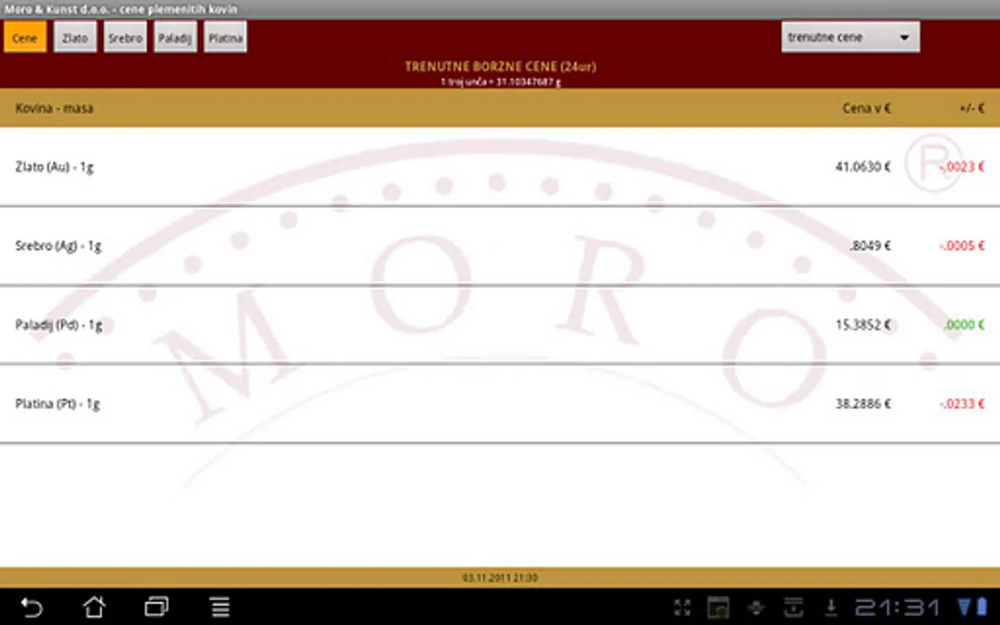 - prikaz borznih cene za plemenite kovine: zlato, srebro, platino in paladij