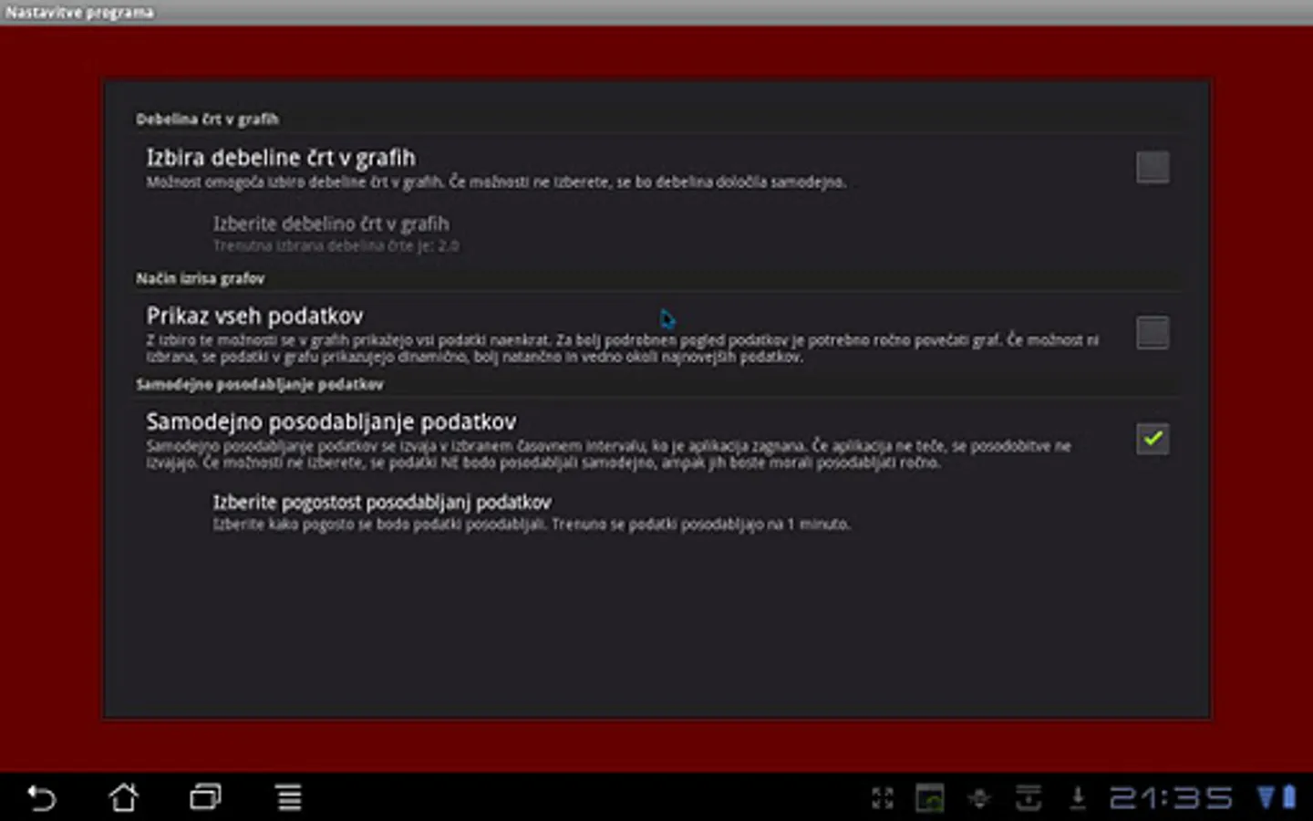 - nastavitev intervala pri samodejni posodobitvi podatkov (od 1 minute do 90 minut)