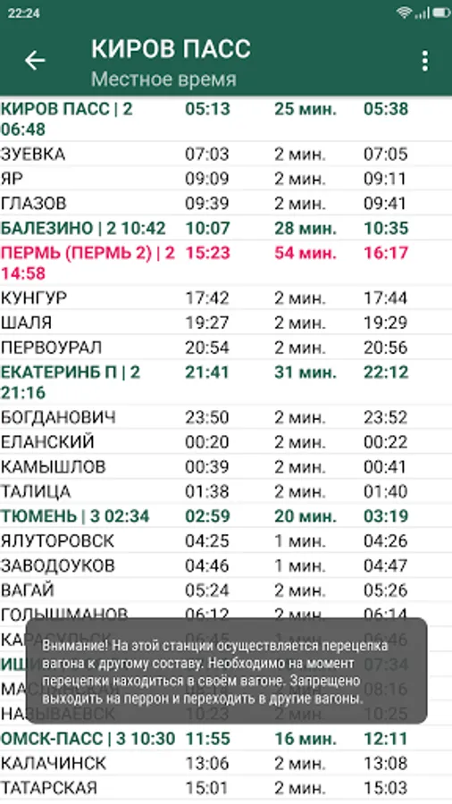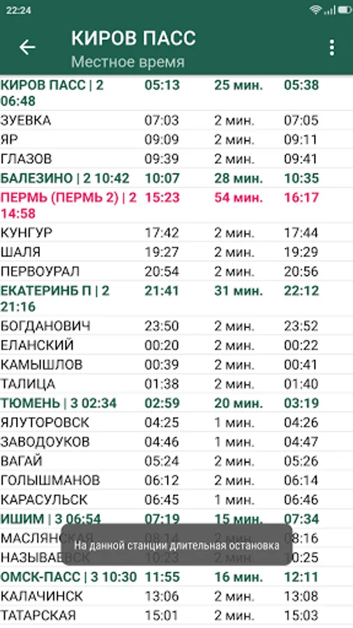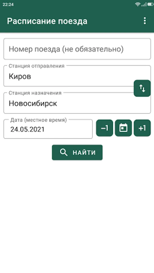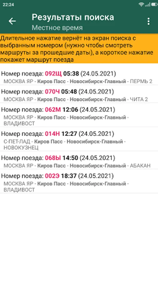 The application displays the train schedule. Long-term stops are highlighted in color and you can easily find out how long they will take. It also supports the display of arrival and departure times in different time zones: Moscow, local and phone time zone. If you have a ticket, you can enter the train number for example "092Ш", the departure station, the destination station and the date of the train departure from the station - in this case, you will immediately see the timetable. If for some reason you do not know the train number, then leave the corresponding field empty, the program will select a list of trains passing through the specified stations. The only limitation of this method is that you can search for routes only for future dates (usually trains run every day or every other day). After you have found your train (for a future date), you can return to the search screen with a long press, select the actual departure date, and click on the search again. In this case, you will be taken to the schedule screen.