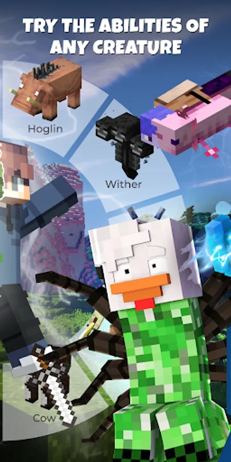 Morph Mods for Minecraft PE is an application that includes a lot of mysterious mods, maps, skins, and a list of servers for total reincarnation in the virtual universe. The modification is filled with original functionality and allows the player to instantly take on the appearance of any killed mob. Use the unique skills of the destroyed creatures. Magical gameplay allows you to transform into each of the killed creepers.