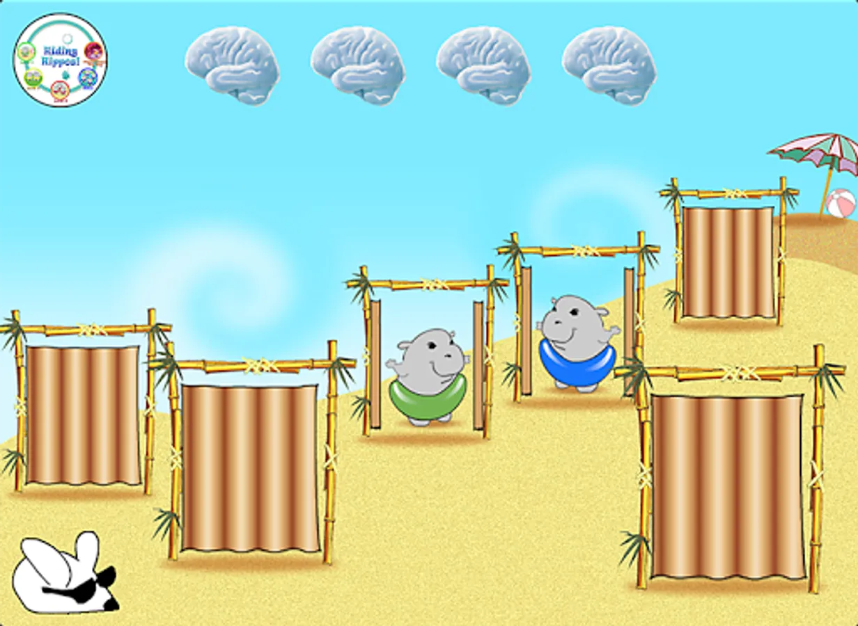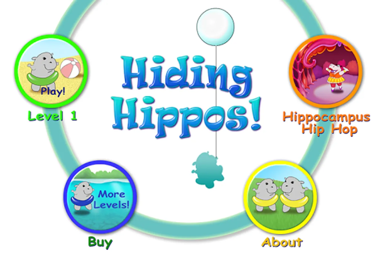 In the first (free) level, hippos wearing various colorful swim tubes run in and out of beach cabanas, laughing as they go. Two of the hippos hide behind cabanas and the player is asked to find different color hippos. After finding all the hiding hippos, a segment of the Hippocampus Hip Hop song plays with nuggets of knowledge about memory and the hippocampus.