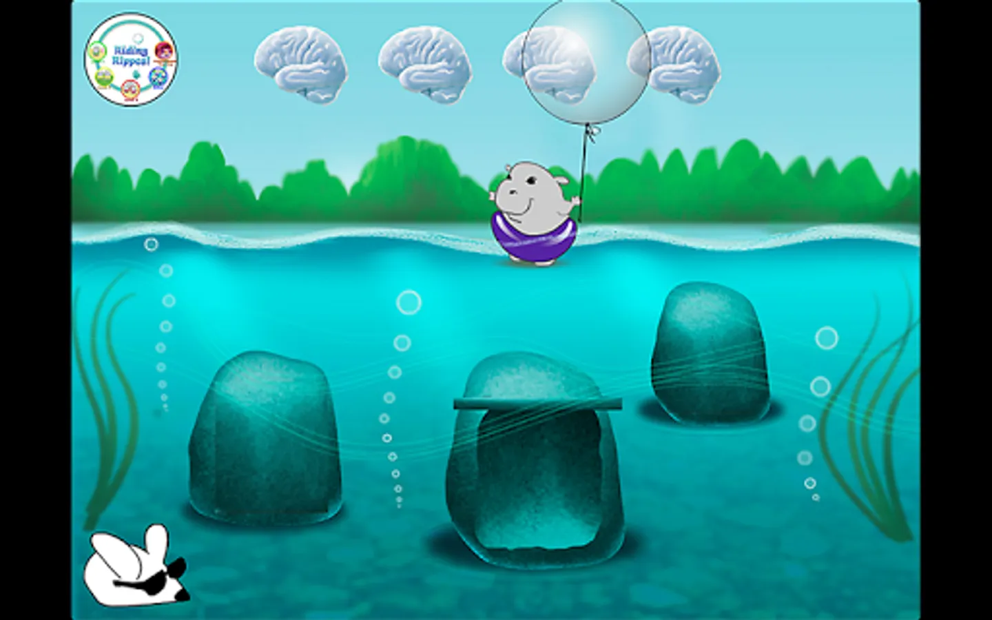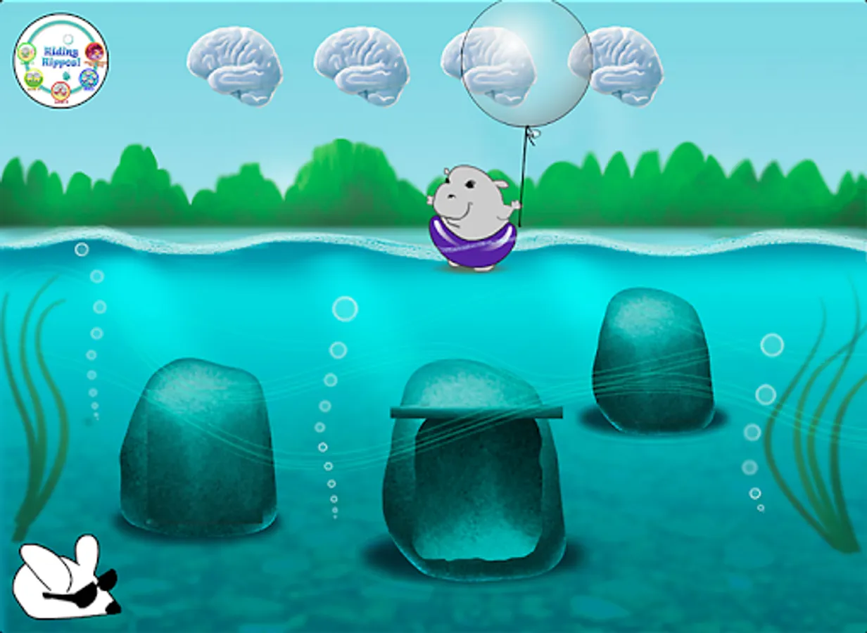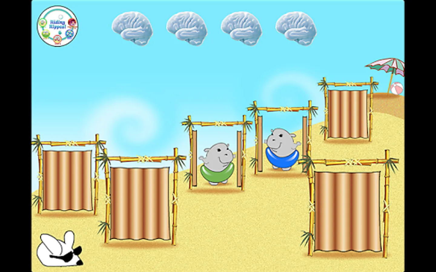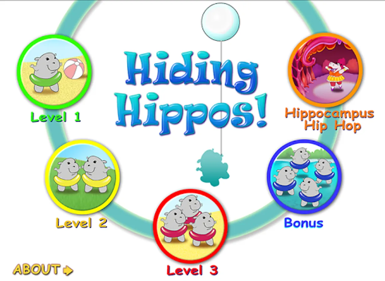 In the first (free) level, hippos wearing various colorful swim tubes run in and out of beach cabanas, laughing as they go. Two of the hippos hide behind cabanas and the player is asked to find different color hippos. After finding all the hiding hippos, a segment of the Hippocampus Hip Hop song plays with nuggets of knowledge about memory and the hippocampus.