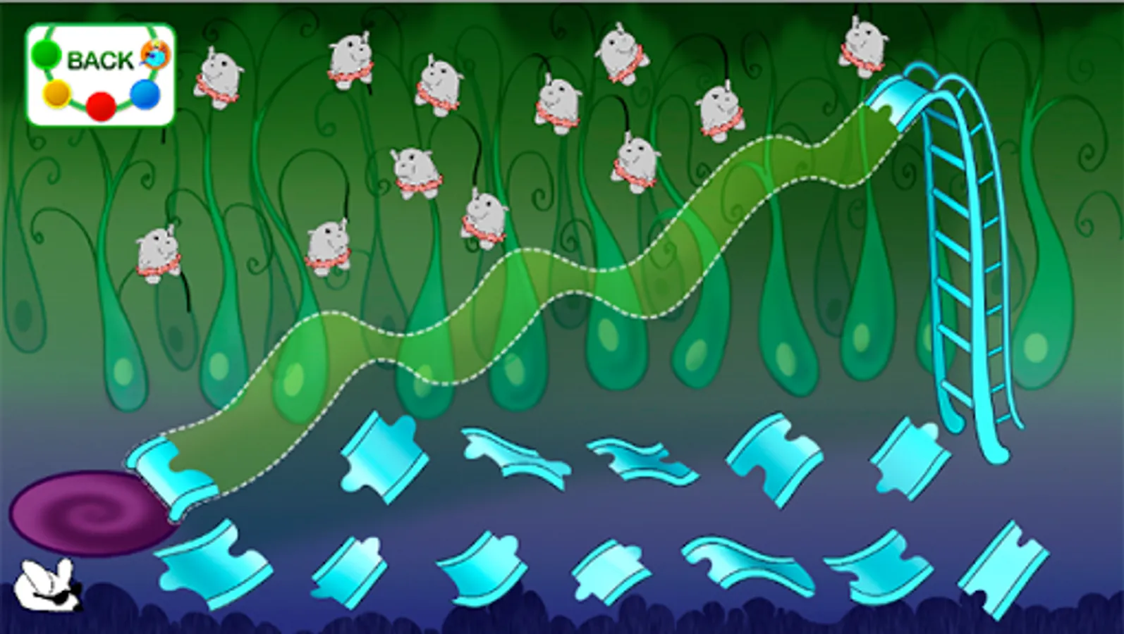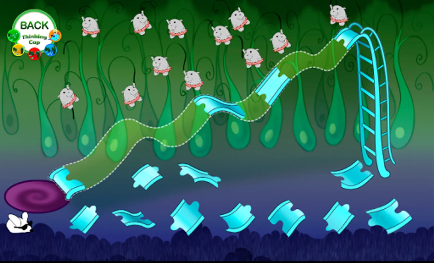Kids start out by finding cute little hippos hiding in trees. The hippos want to get back down to the ground, so the player builds a slide for them. The slide is made up of several pieces which kids puzzle together using problem-solving, logic, and spatial intelligence. When they put all the pieces together, the hippos slide to the bottom.
