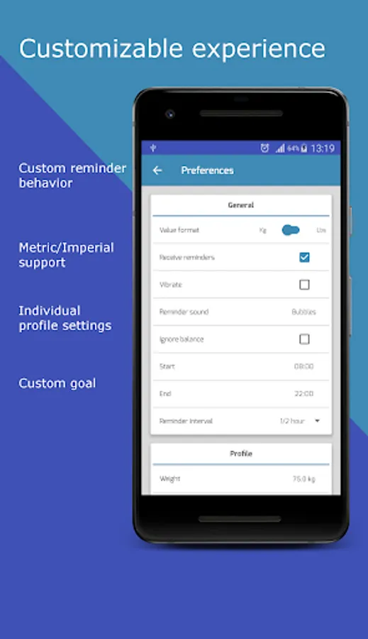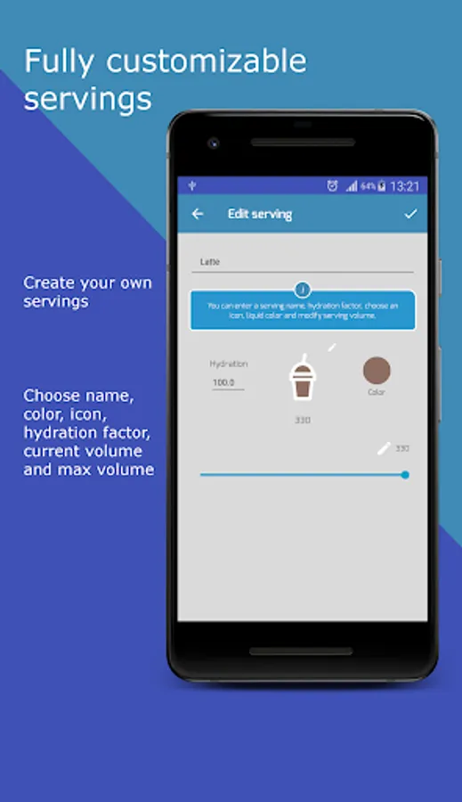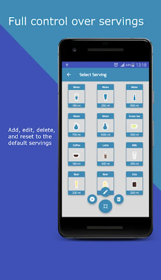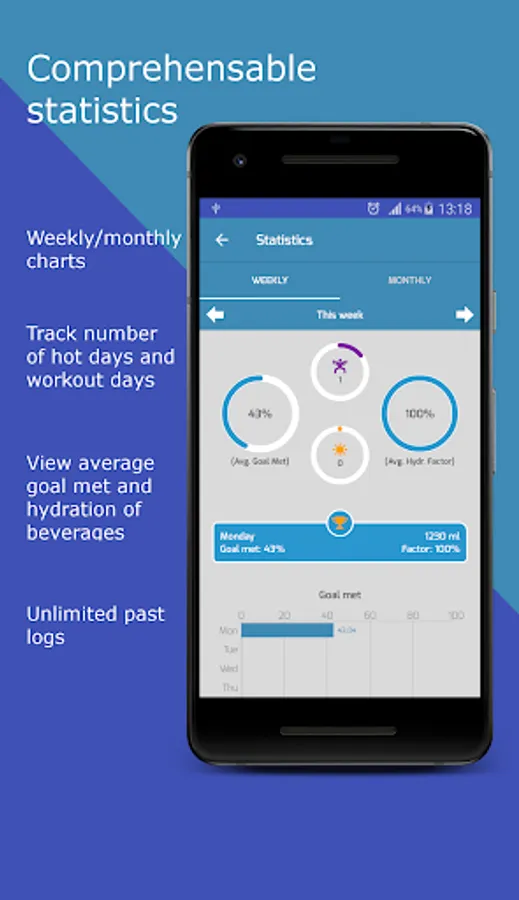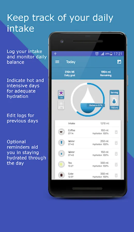 Weekly and monthly statistics are available for easy water intake habit tracking. The recommended daily water intake for every individual is calculated automatically at first app launch and can always be changed later. You can also add, delete and edit servings to your liking.