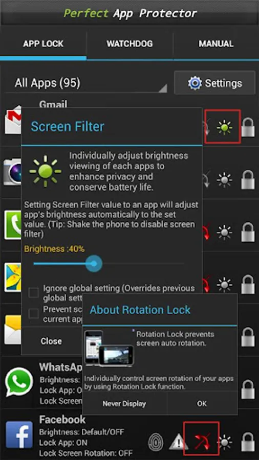 2. Screen Filter support: Effectively manage screen brightness of individual apps