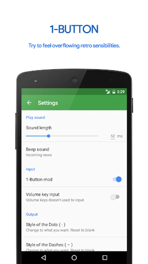 • There are two type of input for Morse code, [1-button] and [3-buttons]. Changeable on settings.
