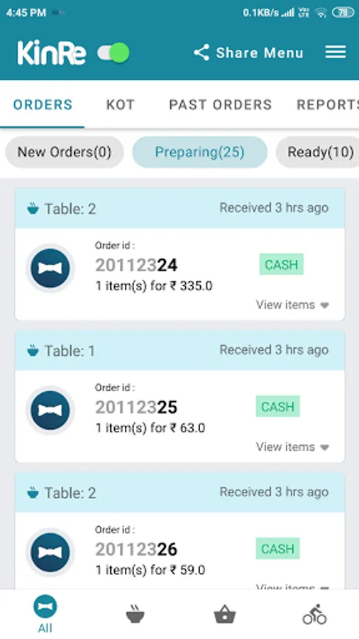 Stores can go online using the signup button in this app. when their shop is listed on kinre customer app, store owners can add their menu and start taking orders placed by customers for dining, takeaway and home deliveries. By signing up from this application, any type of stores can be onboarded on kinre customer app.
