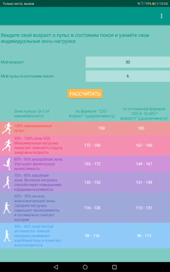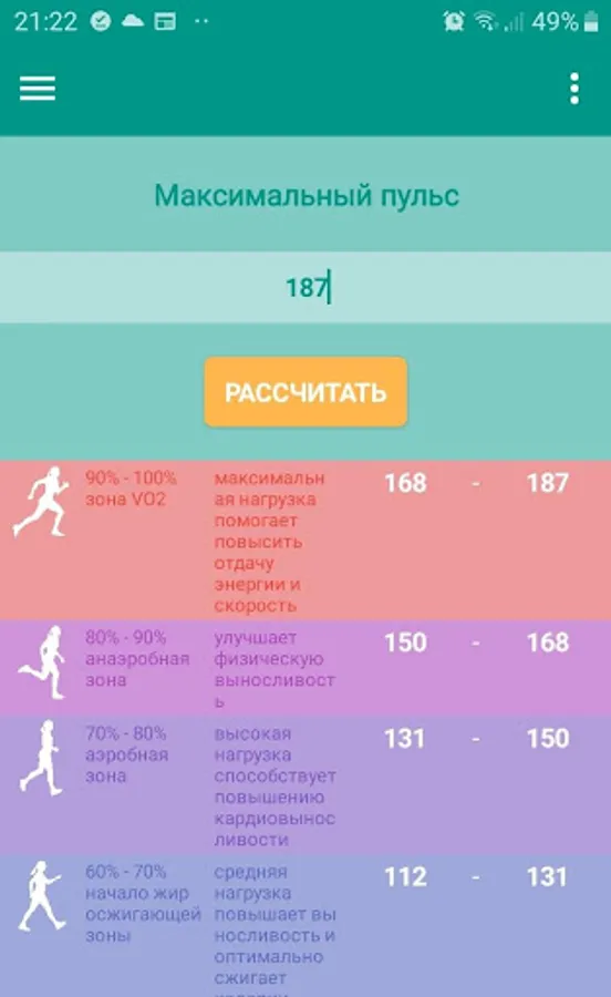 The target heartbeat zone is in the range from 50% to 95% of the MCSV value and is selected depending on the individual differences in the physical condition of the person.