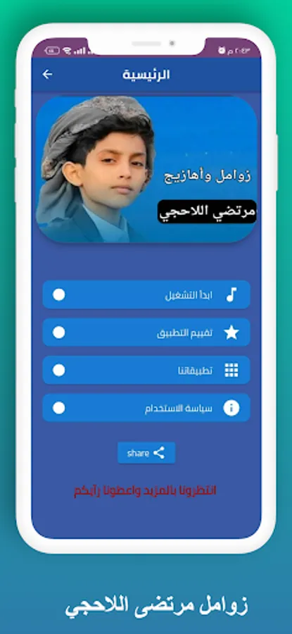 - You can share the application link with your friends on various social media so that they can get all of Mortada Al-Lahji's sheela now and enjoy its features, the most important of which is that it is a simple free application that fits with all phones, taking up a small amount of space on the device.