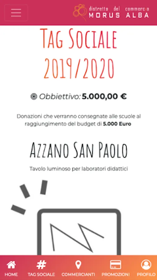 Thanks to the purchase by consumers in participating stores and the scanning of the postcard through the App District Morus Alba, the local schools will receive the required educational material as a gift upon reaching the identified budget.