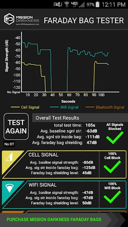 The Mission Darkness Faraday Bag testing app accesses your WiFi, Cell and bluetooth antennas to test the shielding effectiveness of your faraday bag or faraday enclosure. The app is extremely simple and gives you the ability to know whether your faraday bags are doing their job of shielding all signals effectively. A test report is generated with signal shielding measurements.