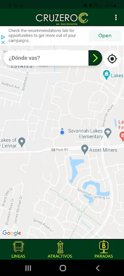 The user enters the line number to search, by clicking on the button it shows a photograph of the bus, and 2 options above, "Ver Ruta" and "Puntos de interes", ver ruta (route view) shows the path of the bus georeferenced on a map of the city of Santa Cruz, in "puntos de interes" (landmarks) shows the most important landmarks on the selected route along with travel times from point to point, to give the user an idea of the approximate travel time of its trip.