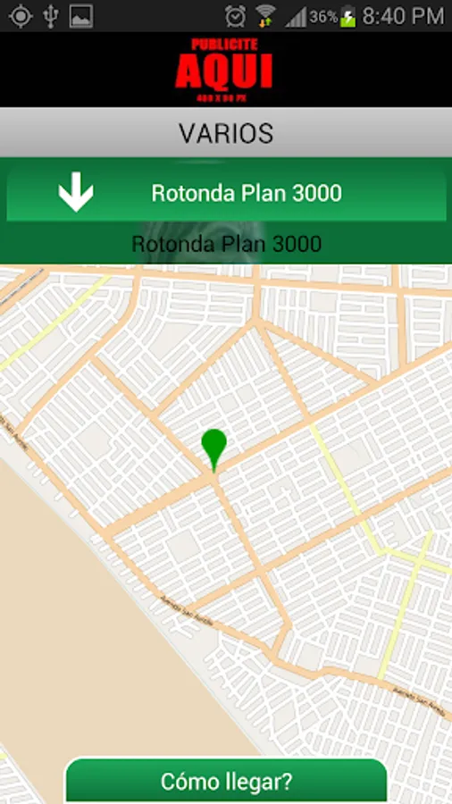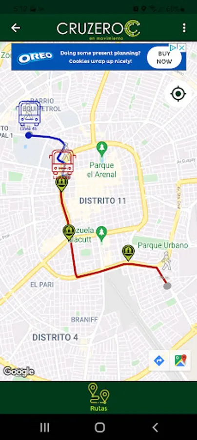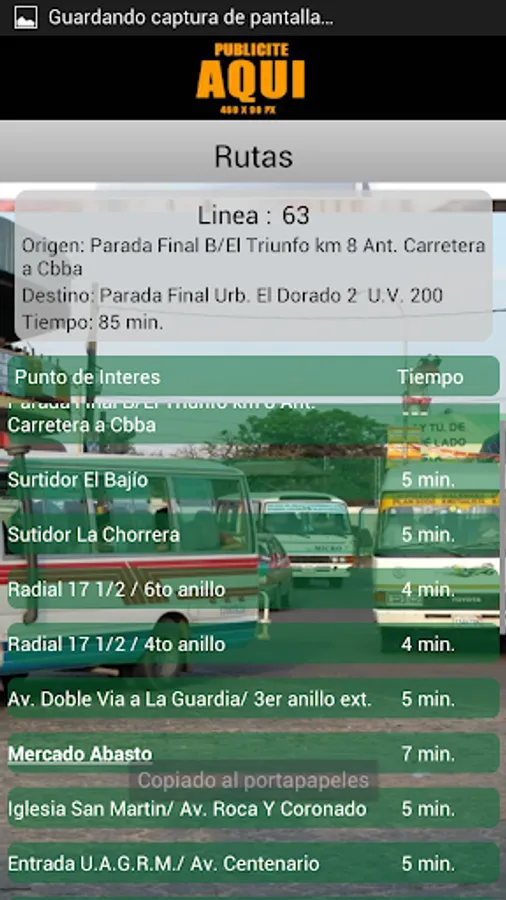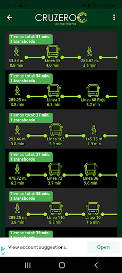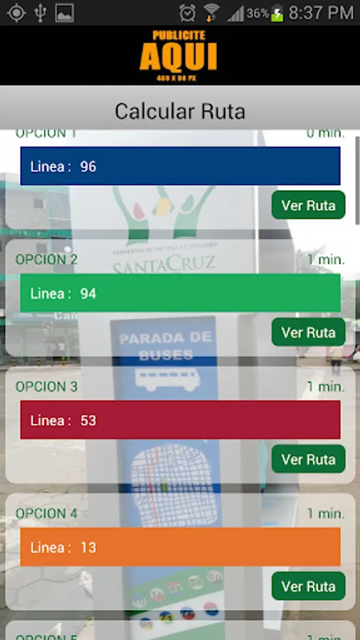 By clicking on the desired routes, you are shown a photograph on how the bus line looks like, to deliver a graphical information about how it looks like the bus you have to take, then by clicking on the "ver ruta" (route view) the user can see the path that describes the bus line to the destination. The results are ordered in such way so that the option with the shortest travel time appears first.