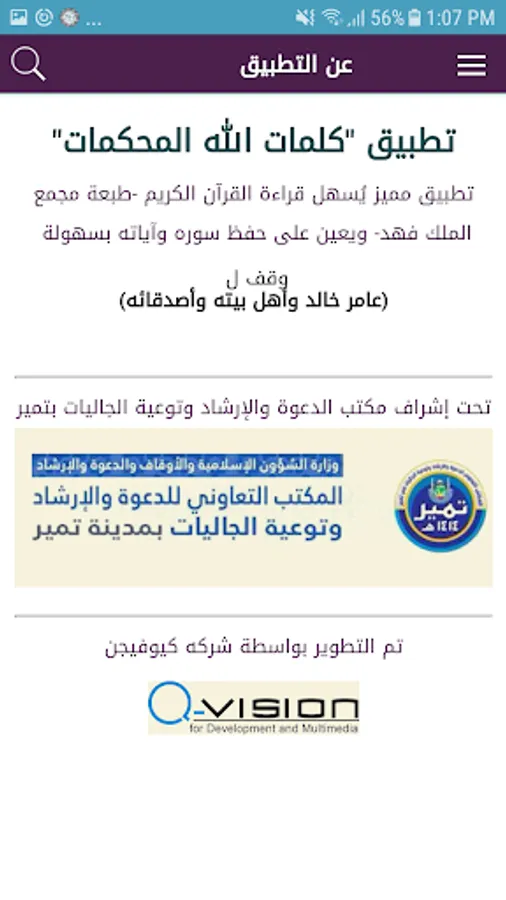 The application of the words of God umpires stop Amer Khalid and his family and his friends, a special application that helps you to recite and memorize the Holy Quran -broaah Hafs Uthmanic-at any time without having to connect to the Internet, where the application is easy to navigate between the pages and flexible search in the verses of the Quran and benchmarking to determine the verse and save them to return to her, and all that is clear and comfortable line of the eye.