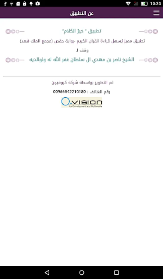 The application of "good speech" cessation of Sheikh Nasser bin Sultan Al Mahdi Allah forgive him and his parents, you can read the whole Quran -broaah Hafs al-Othmani and gives you a unique view of the Koran pages with the possibility of movement between them in an easy way.