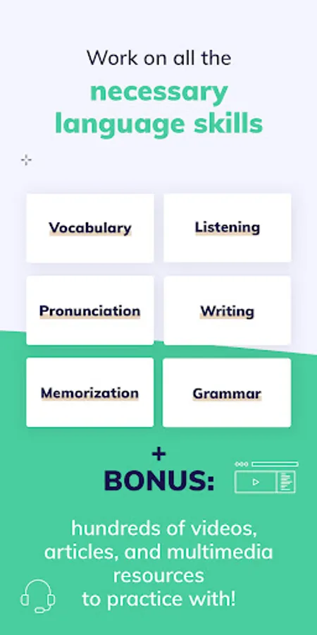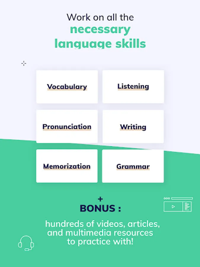 A structured course, built upon the four pillars of language learning: listening, pronunciation, writing, and memorization.