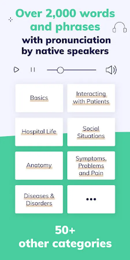 11 unique categories: Interacting with patients, Hospitals, Social situations, Symptoms, Anatomy, Pathology, Medication, Medical tests, Patient care, Specializations, and more.