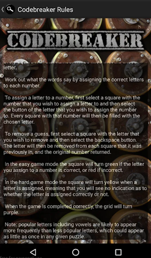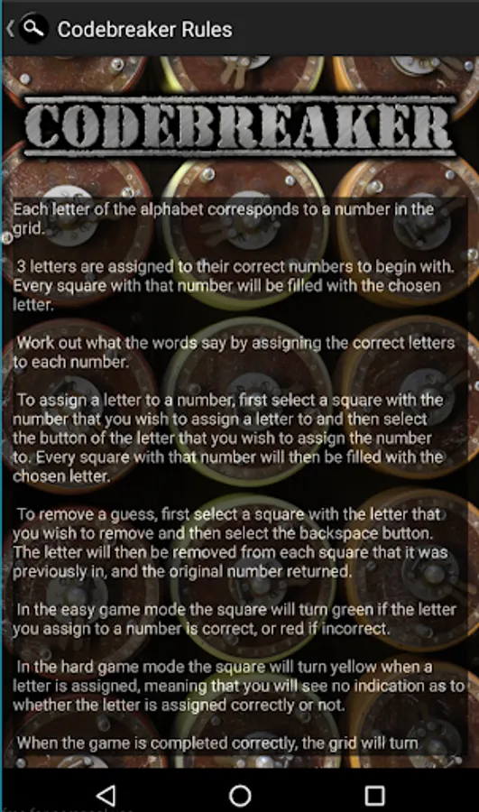 Codebreaker is a crossword-type puzzle game which requires the user to break the code by working out what the words say when given a few initial letters (there are no clues)