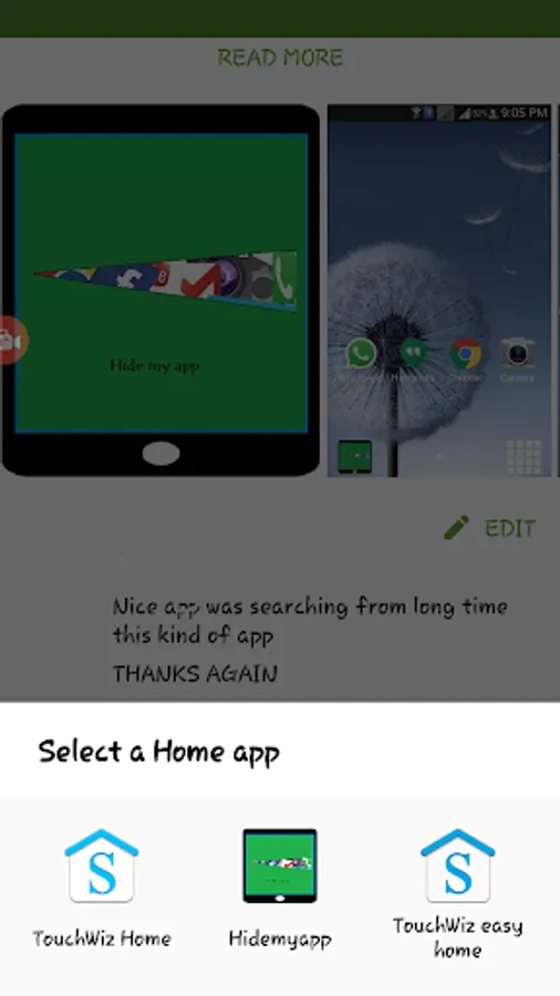 Once App installed it will ask bydefault homeview you need to choose i.e. for samsung Touchwiz Home to hidemyapp
