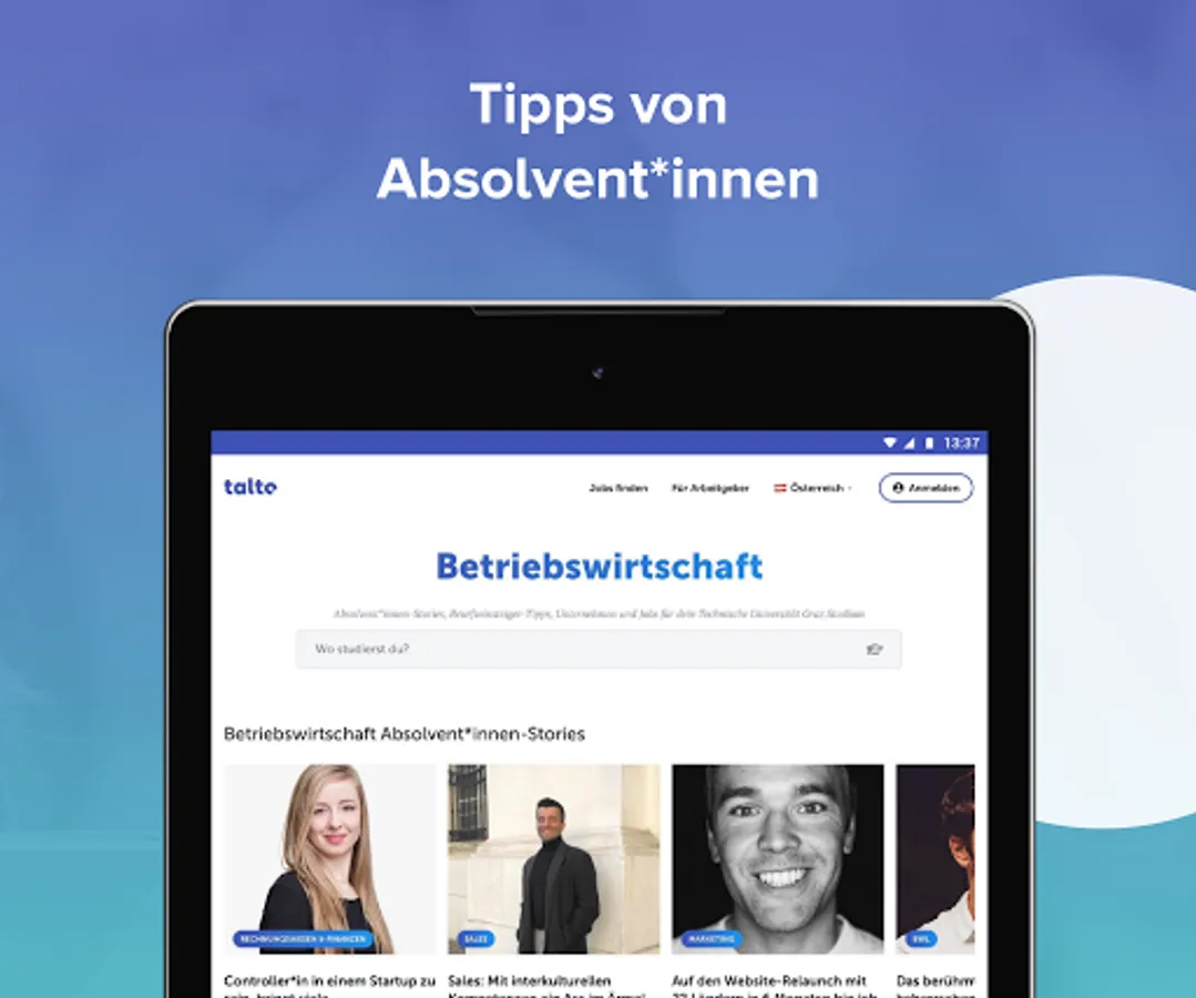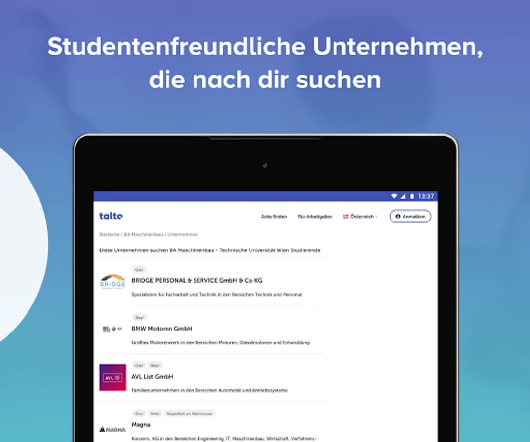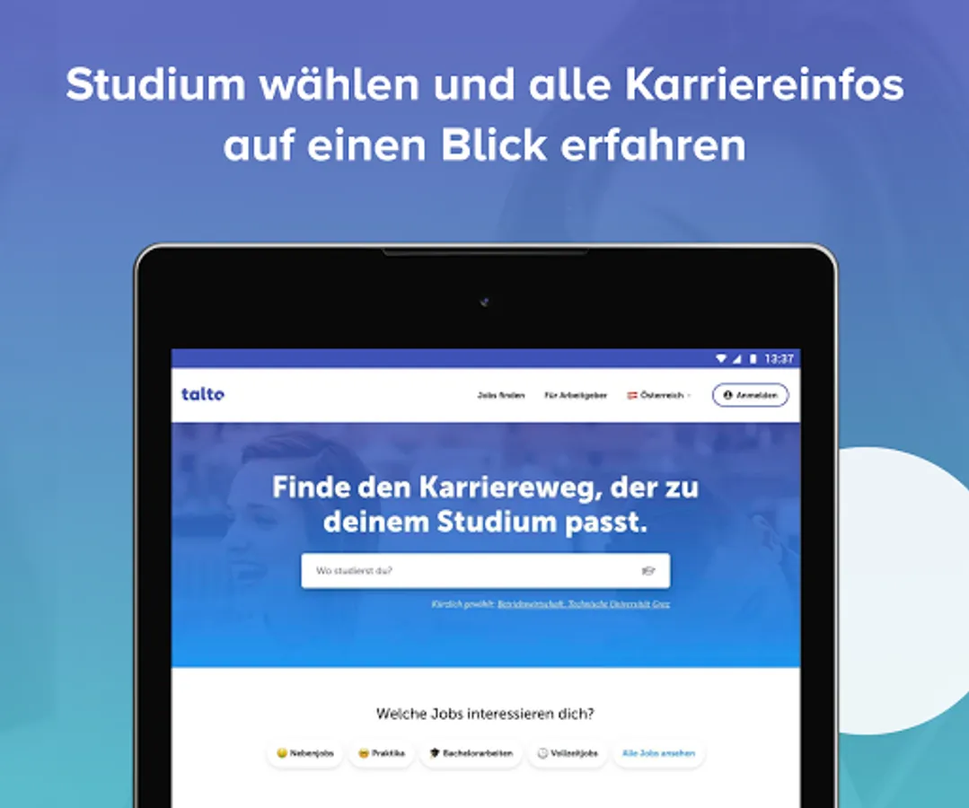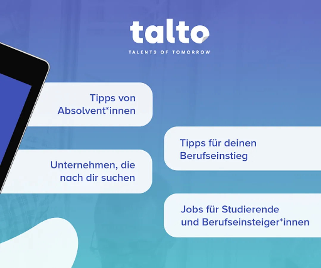 Talto is the largest mobile career platform for students and young talents in Austria who want to pursue a career and are looking for a job! On Talto you will find all the information and tips you need to start your career.