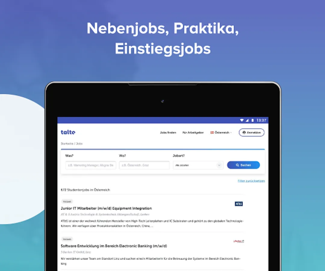 Find a job quickly and easily in the company that really fits your resume. With the job search from Talto you have access to current jobs in Vienna, Linz, Graz, Salzburg, Innsbruck and in many other cities in Tyrol, Vorarlberg, Lower Austria, Salzburg, Vienna, Styria and other federal states in Austria. Look forward to the best student job, university job or another job with the Talto job exchange - your decision! The job search by mobile phone is finally here! Which company would you like to have on your resume? Start your career! :-)