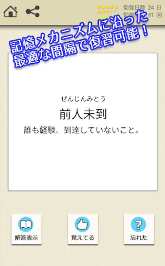 「解答表示」で解答を確認し、覚えていた場合は「覚えてる」、忘れていれば「忘れた」を押します。